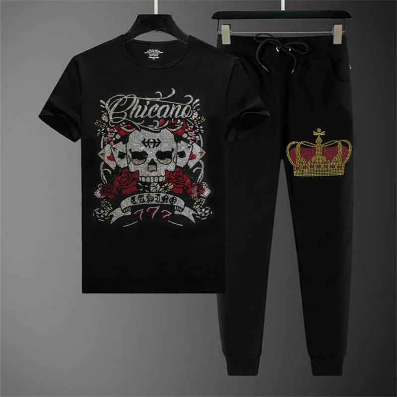 Мужской новый тренд высокого качества Стразы Цветы и череп дизайн тонкая и удобная спортивная одежда Повседневная футболка + брюки костюм