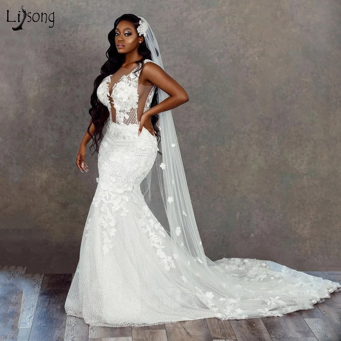 Элегантное кружевное свадебное платье с юбкой-годе 2021, африканские Свадебные платья без рукавов с фатной аппликацией, свадебные платья для невесты
