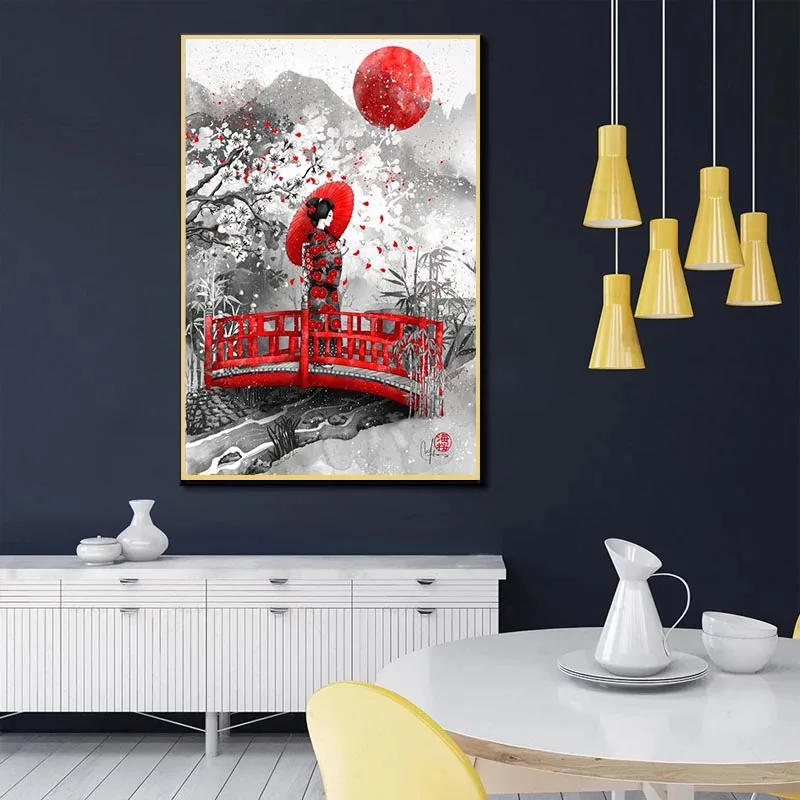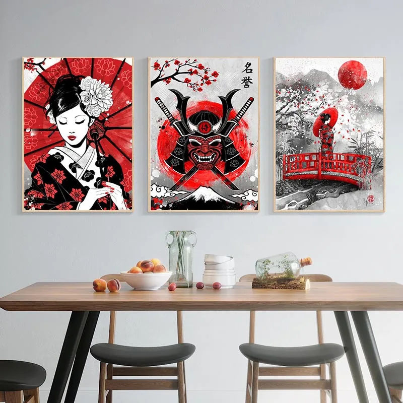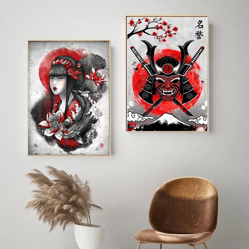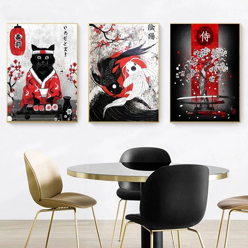 Японский гейш и Инь и Янь, рыба, самурайский холст, Настенная комната, гостиная, японский декор для столовой