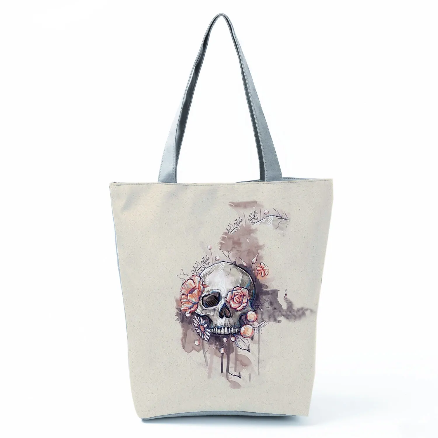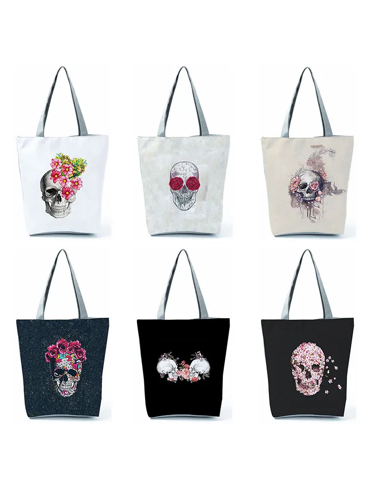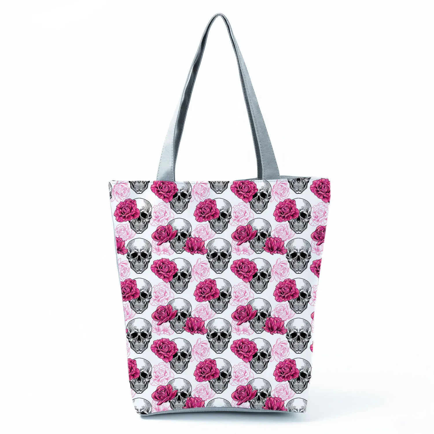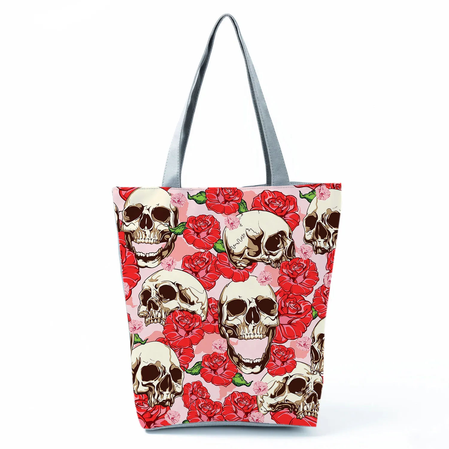 Большая сумка на плечо с принтом черепа и цветов для женщин, Модная Портативная дорожная Повседневная многоразовая Сумочка для покупок в стиле ретро, тоут на Хэллоуин
