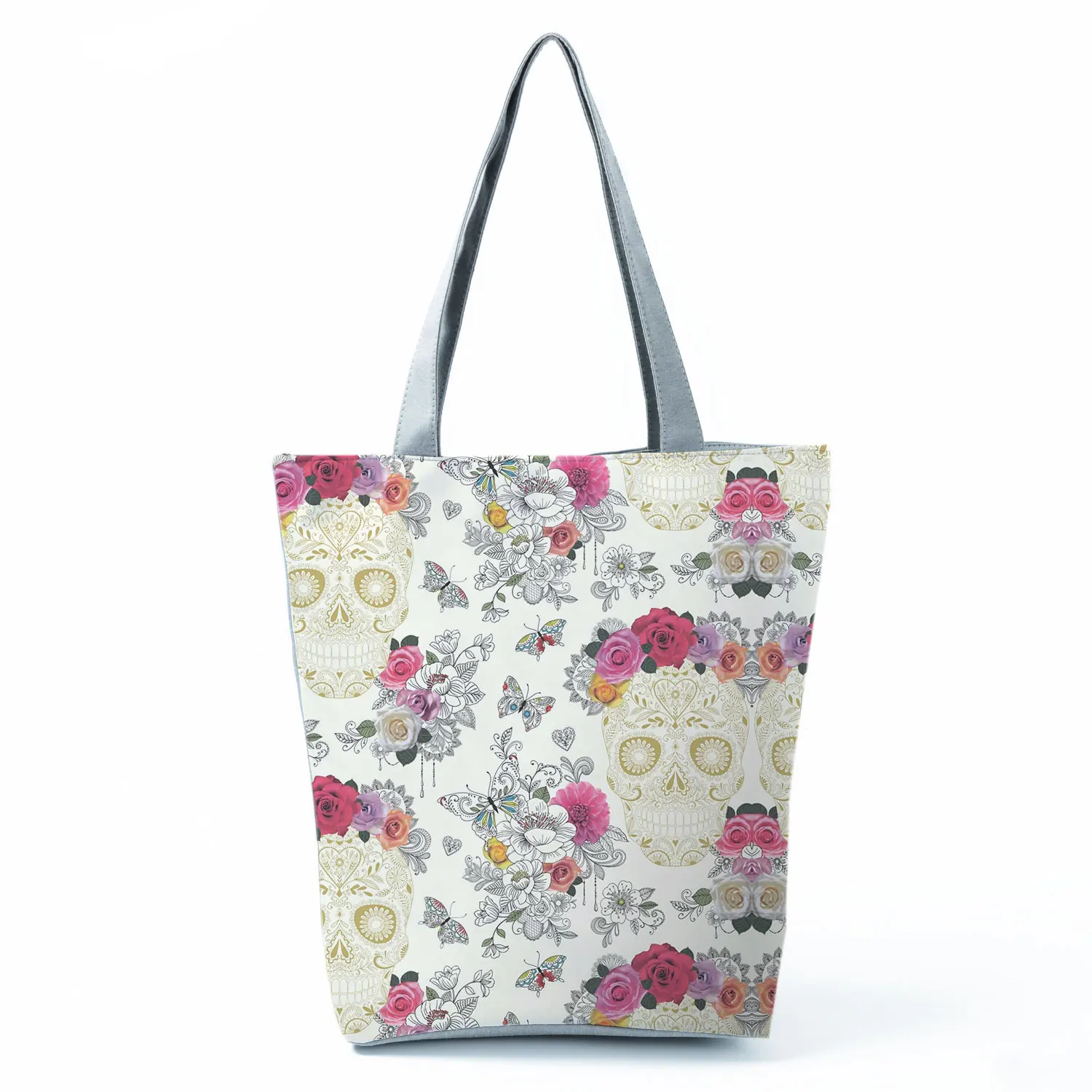 Большая сумка на плечо с цветочным принтом и черепом для Хэллоуина для женщин, Модная Портативная дорожная сумка, Повседневная многоразовая сумка для покупок, Ретро сумка-тоут