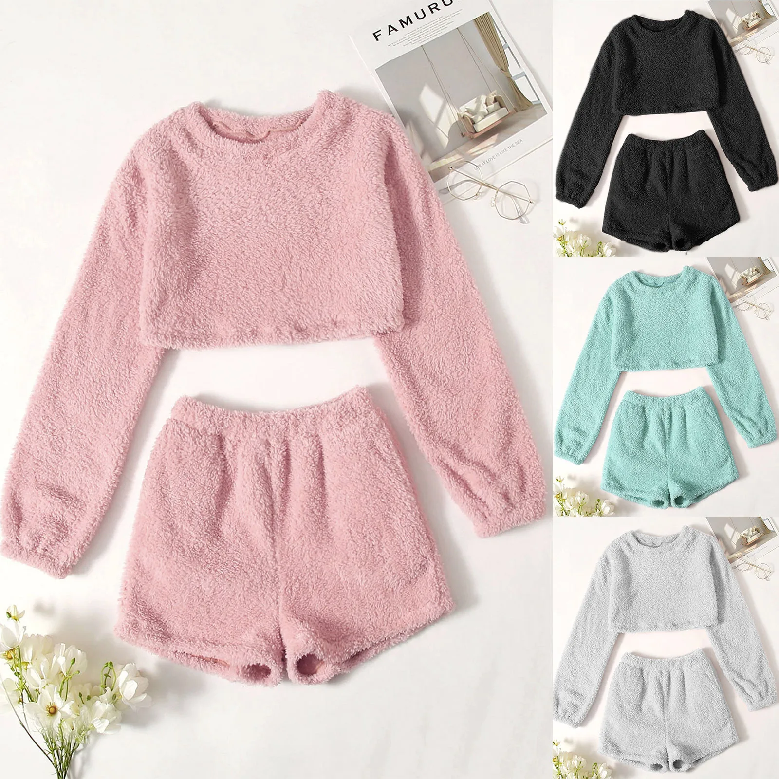 Пижамный комплект с принтом бабочки, Осенний Теплый Мягкий Розовый пуловер с длинным рукавом и круглым вырезом и шорты, женский зимний костюм, пикантная Пижама