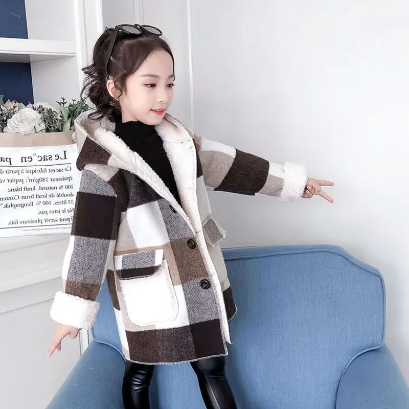 Детское шерстяное пальто в клетку, куртка средней длины для девочек на осень и зиму