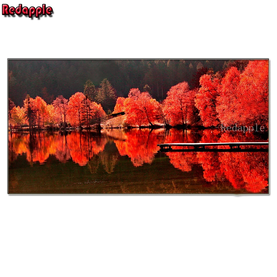 Алмазная 5D Вышивка Красные Деревья и озеро, картина с полными квадратными и круглыми стразами сделай сам, картина большого размера с природными пейзажами