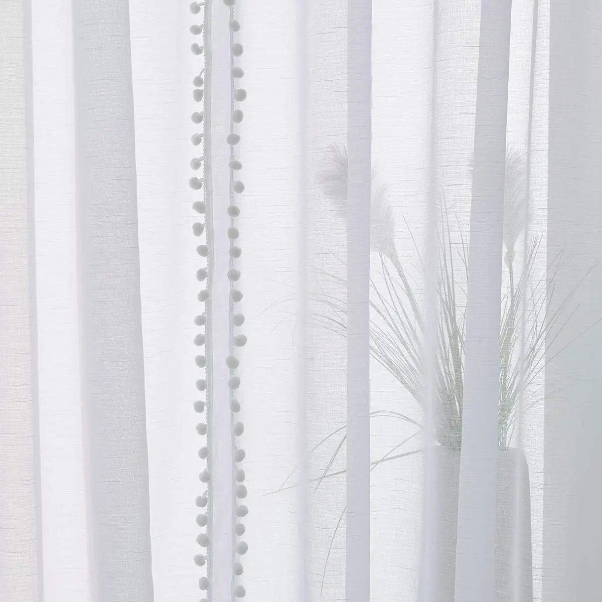 Белая прозрачная занавеска с помпоном для гостиной, льняная текстур...