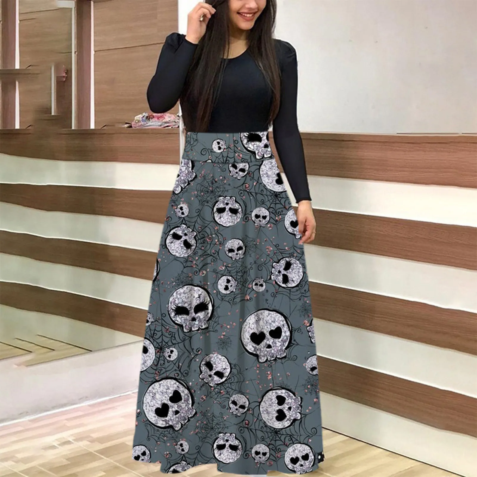 Женское плиссированное платье макси, элегантное винтажное платье с длинным рукавом, круглым вырезом и принтом черепа для Хэллоуина, 2021