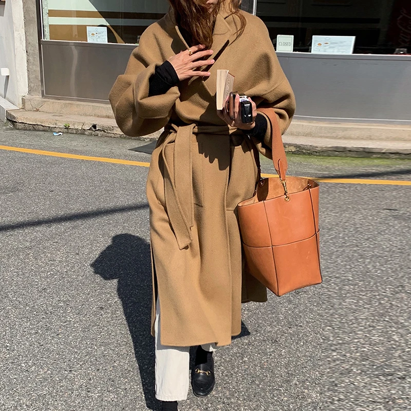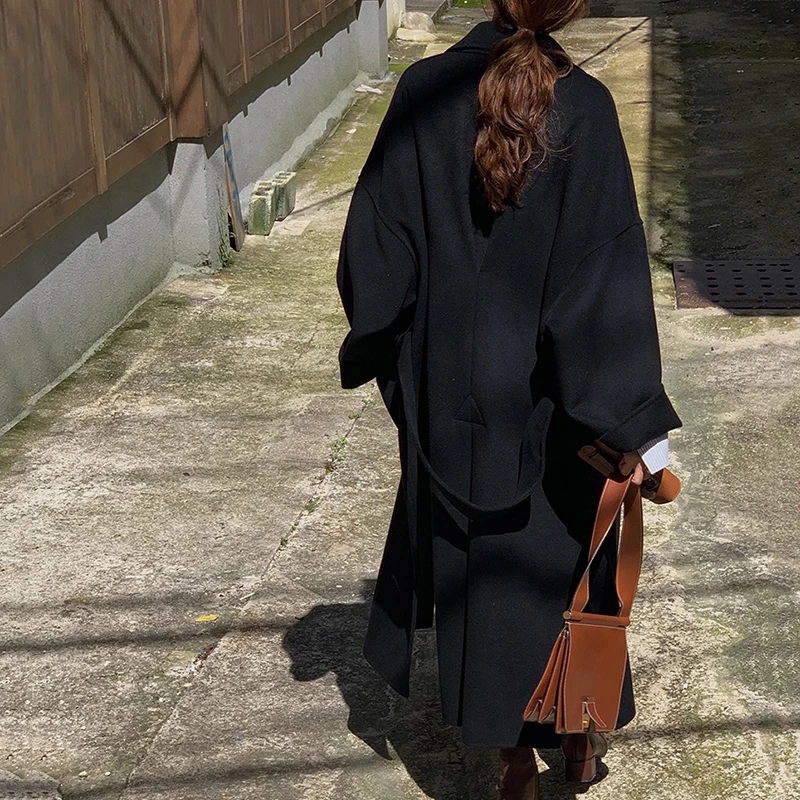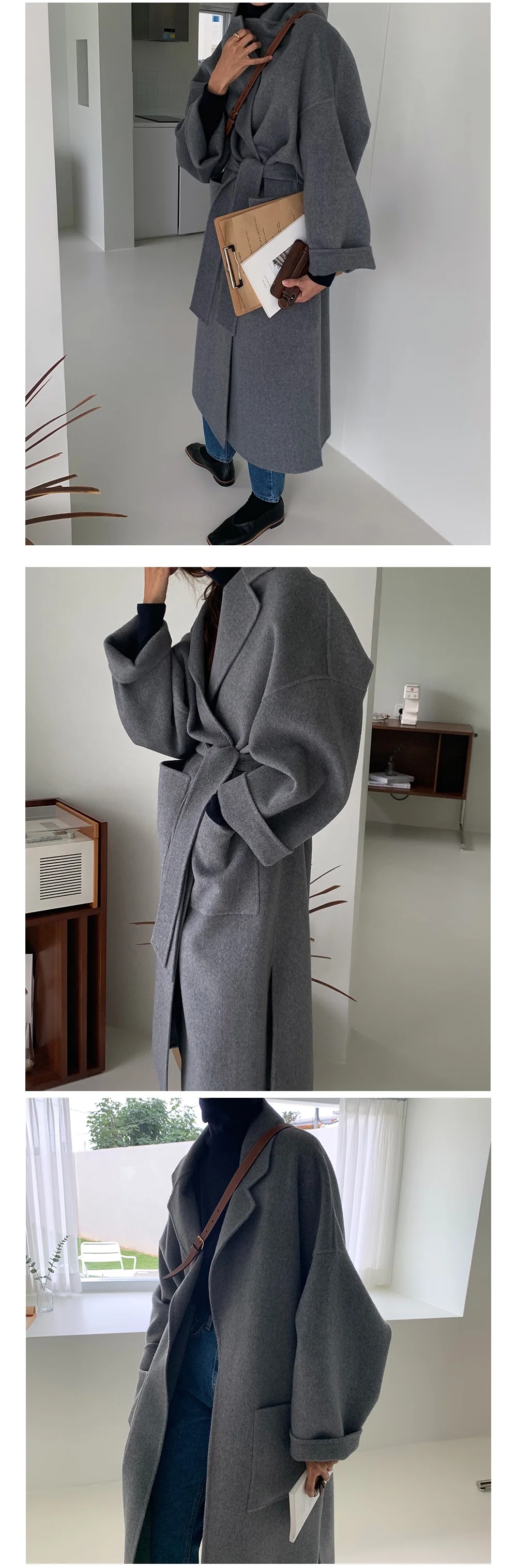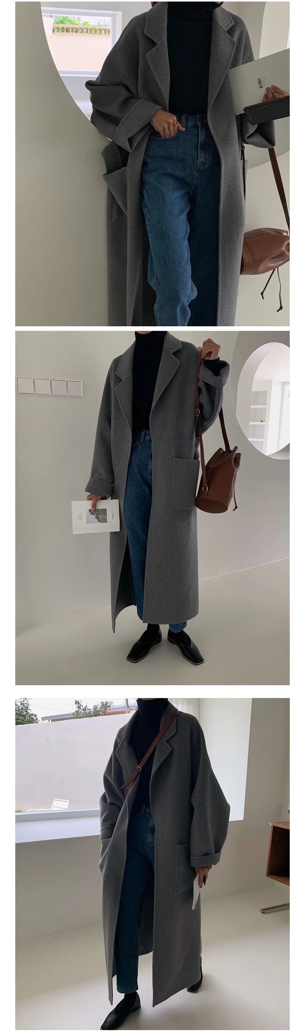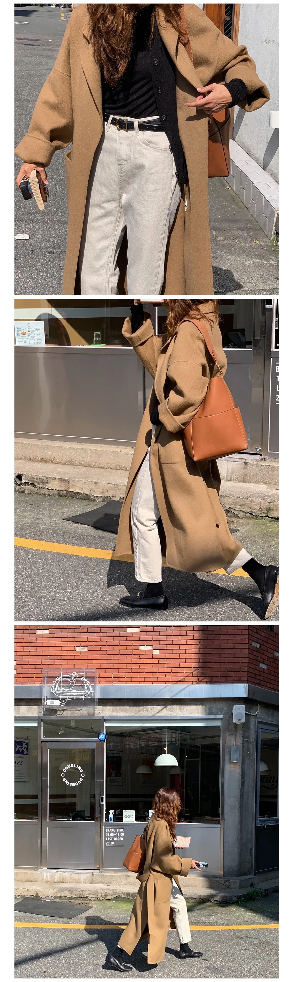 Женское шерстяное пальто в стиле ретро, свободная шерстяная куртка с большими карманами, Длинная шерстяная ветровка с разрезом, пальто на осень и зиму
