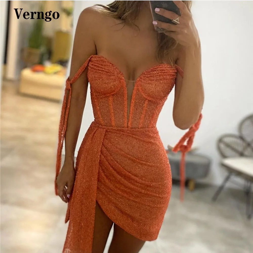 Блестящее оранжевое короткое коктейльное платье Verngo с открытыми плечами, плиссированная укороченная юбка, вечерние платья для выпускного вечера