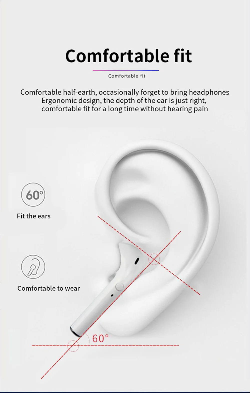 Характеристика: 1. Короткое воспроизведение (пауза) музыки/ответ на вызов; 2. Двойное (правое) двойное короткое нажатие для уменьшения (увеличения) громкости; 3. Левый (правый) наушник нажимает 3 следующую (последнюю) музыку; 4. Легко просыпается Siri 5. Отменить открытую ситуацию и закрыть ее до закрытой ситуации; Параметры продукта: 1. Вес изделия: 4-5g (один наушник). 2. Время работы: 2-3 часа. 3. Время работы в режиме ожидания: 100/ч для одного уха и 60/ч для обоих ушей. 4. Время зарядки: 1-1,5 часов. 5. Емкость аккумулятора одного наушника: 35 мАч. 6. Зарядное устройство Betty: 300 мАч. 7. Беспроводное расстояние (разблокировано): 10 м. 8. Совместимые мобильные телефоны: наушники совместимы с Android, IOS,Microsoft и т. д., 100% мобильных телефонов с Bluetooth. Товары включают: 1 * одна пара bluetooth-гарнитур 1 * зарядное устройство 1 * ушные каучуки 1 * зарядный кабель 1 * Руководство пользователя Уважаемые покупатели: мы проводим строгие испытания для каждого продукта перед отправкой, если есть проблемы с качеством или какие-либо вопросы об использовании, пожалуйста, свяжитесь с нами, прежде чем начать спор. Мы уверены, что можем достичь соглашения нашим сервисом и коммуникацией. Спасибо. Желаем вам приятных покупок!