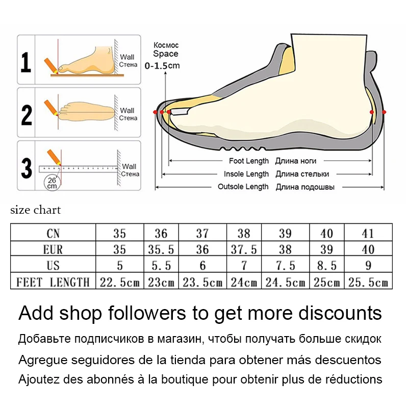 Примечание:Пожалуйста, выберите размер обуви в соответствии с длиной Вашей стопы, а не длиной стельки.