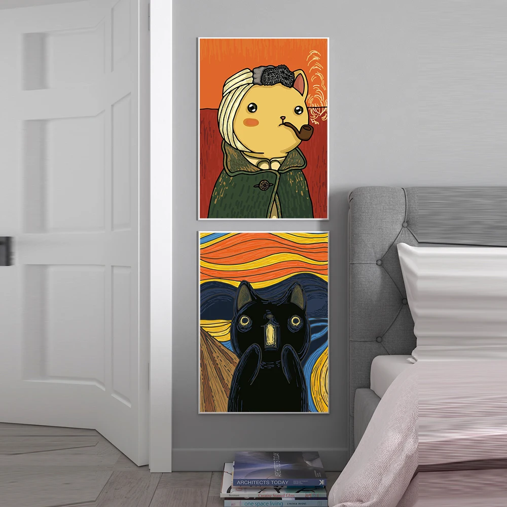 Картина на холсте с изображением Винсента, мультяшной кошки, леди, постер, монолиса, Забавный принт, кошка в жемчужинах, серьги, настенные картины, декор для детской комнаты и дома