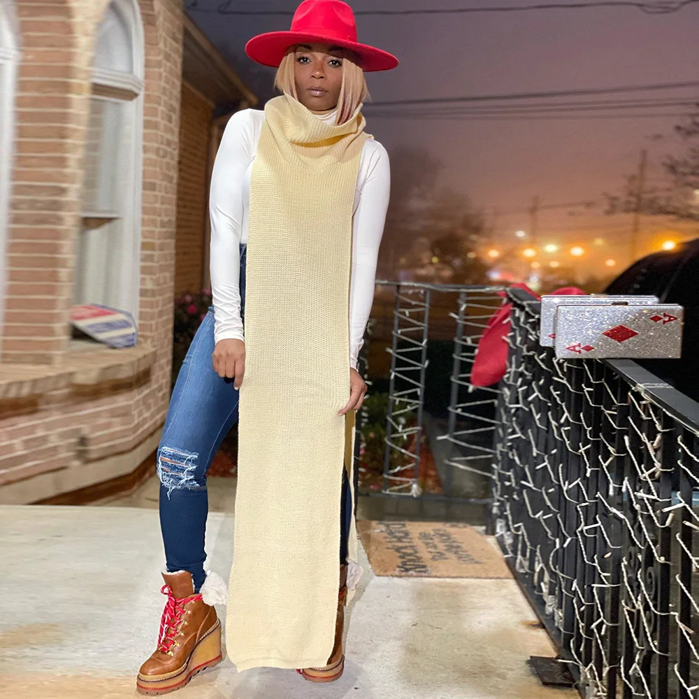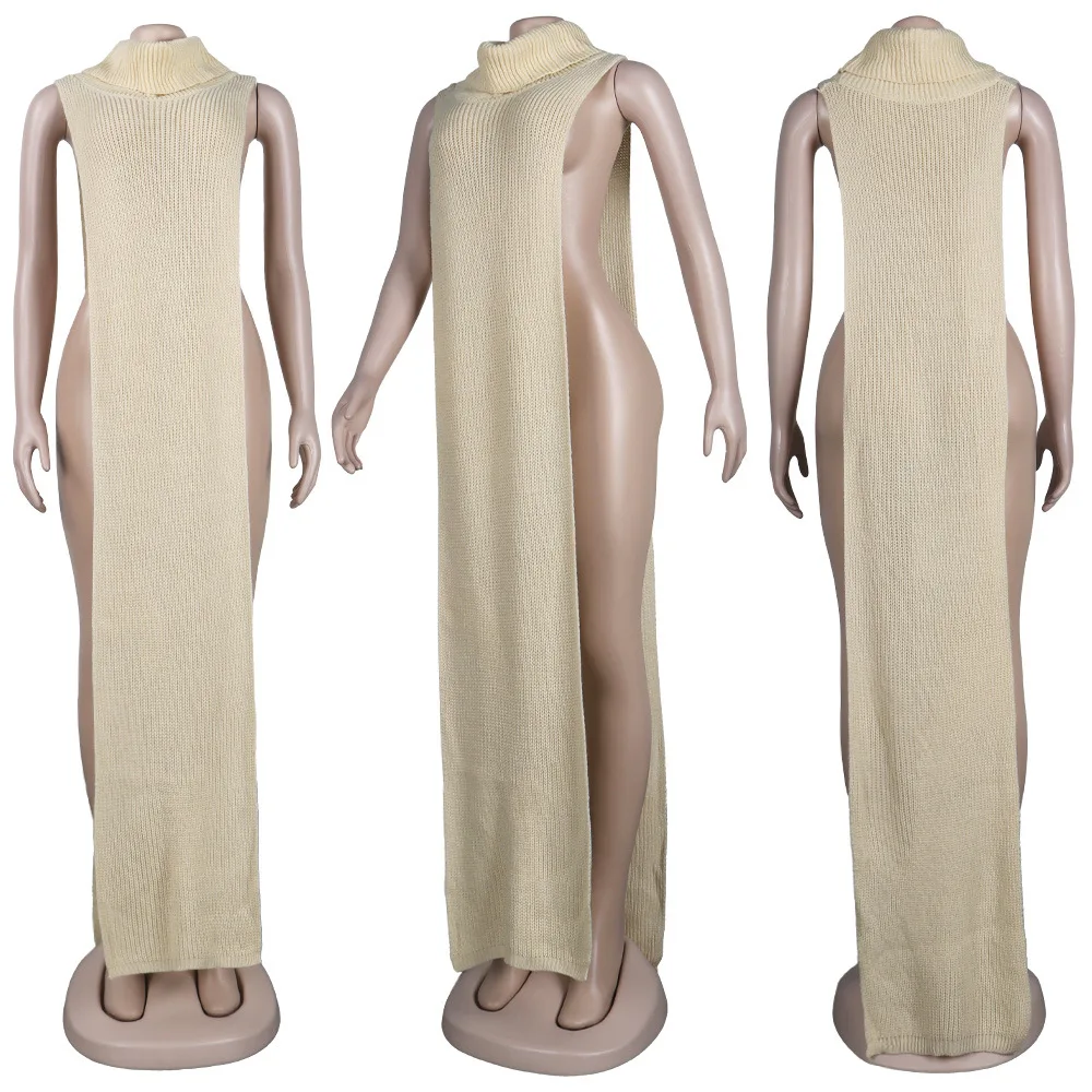Женское трикотажное платье-свитер, Осень-зима, модное Свободное платье с воротником-хомутом, длинное Повседневное трикотажное платье макси, безрукавный с Боковым Разрезом