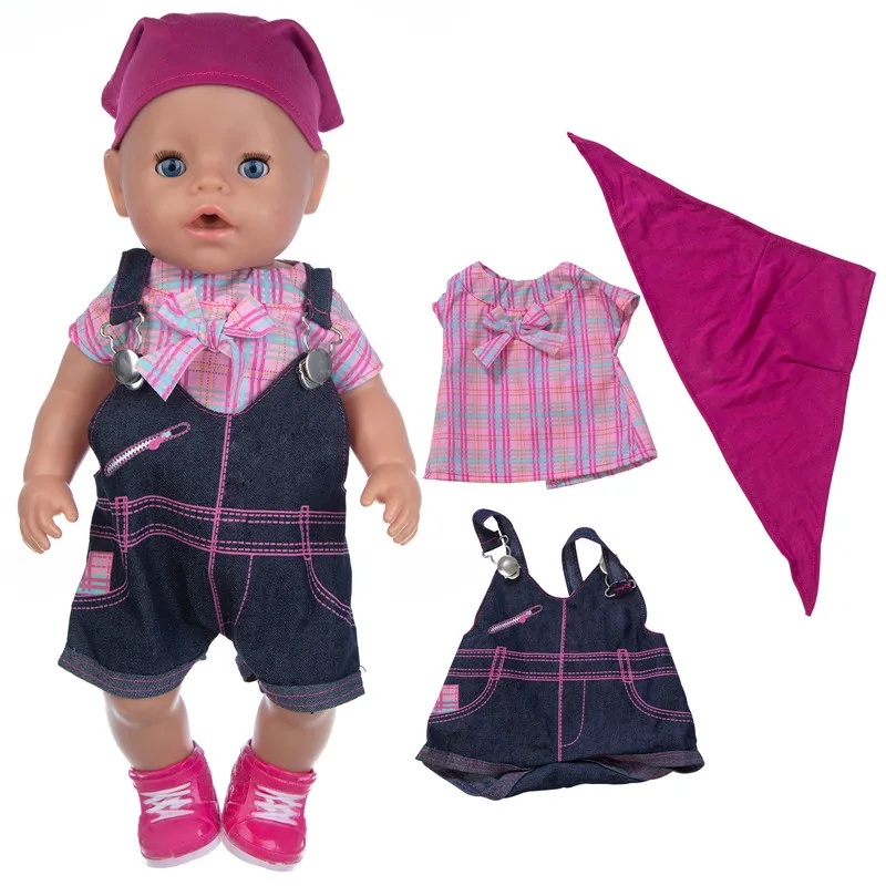 Новинка 2021, милый комплект для новорожденных, подходит для кукол 18 дюймов 43 см, аксессуары для одежды, костюм-тройка с шапкой и джинсовой клеткой в подарок