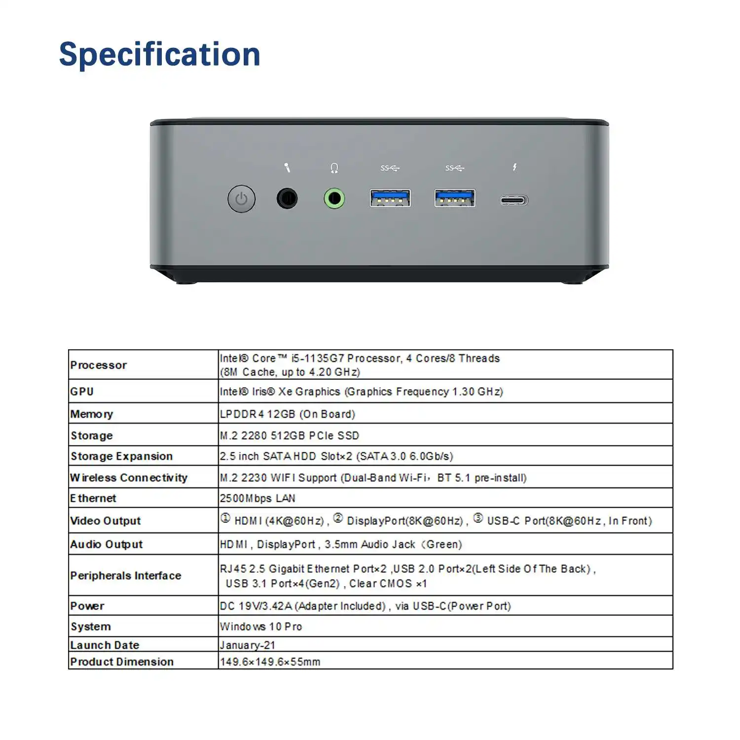 Спецификация:Процессор: процессор Intel Core i5-1135G7, 4 ядра/8 потоков (8 Мб кэш-памяти, до 4,20 ГГц)Графический Процессор: Intel IrisXe Graphics (графическая частота 1,30 МГц)Память: LPDDR4 12 Гб (на плате)Память: M.2 2280 0 ГБ/256 ГБ/512 Гб PCIe SSDРасширение памяти: 2,5 дюймов жесткого диска SATA HDD Slot× 2 (SATA 3,0 6,0 ГБ/сек.)Беспроводное подключение: Поддержка M.2 2230 WIFI (двухдиапазонный WIFI, предварительная установка BT5.1)Ethernet:2500 Мбит/с LANВидеовыход: ① HDMI-совместимый (4K @ 60Hz),② порт дисплея (8K @ 60Hz) , ③ порт USB-C (8K @ 60Hz, спереди)Аудиовыход: HDMI-совместимый, DisplayPort, 3,5 мм аудио разъем (зеленый)Интерфейс периферийных устройств: RJ45 2,5 гигабитный Ethernet Port× 2, USB 2,0 Port× 2 (левая сторона задней панели), USB 3,1 Port× 4(Gen2), Clear CMOS× 1Мощность: 19 в/3,42а постоянного тока (адаптер входит в комплект), через USB-C (порт питания)Система: Windows 10 Pro
