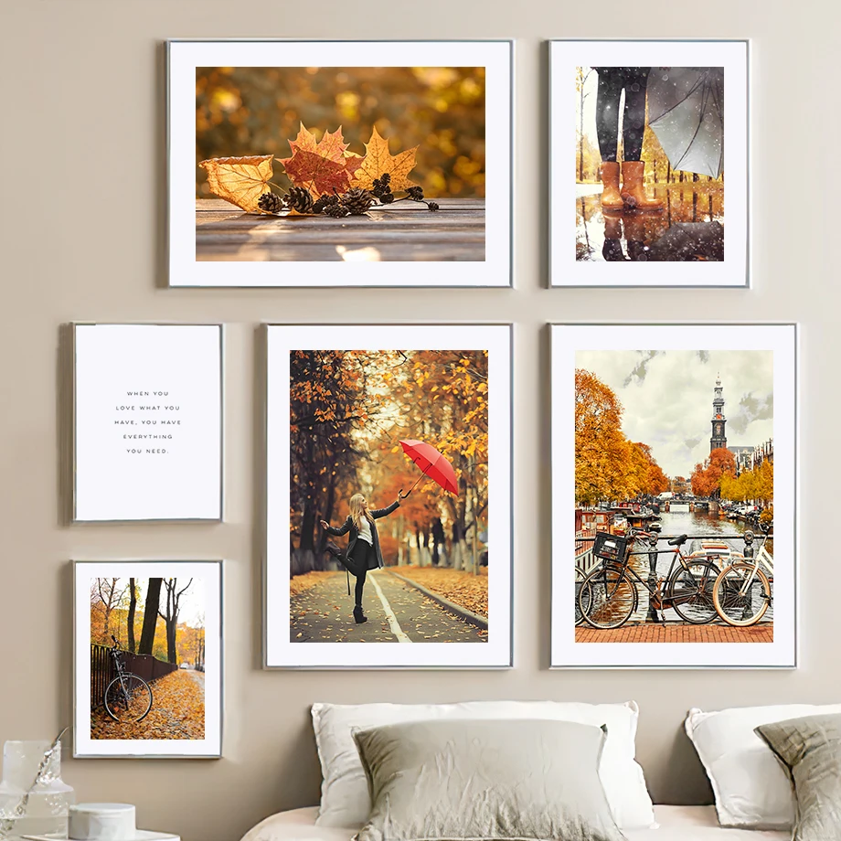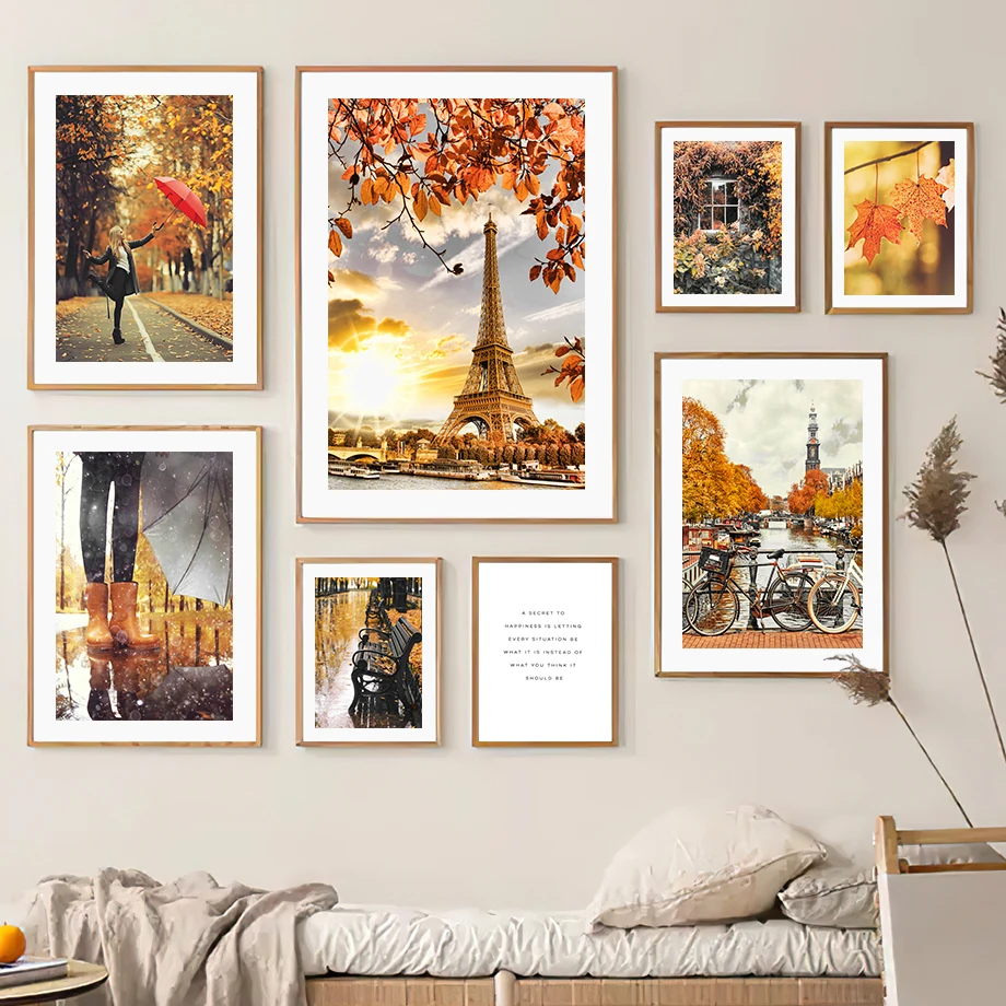 Картина на холсте Париж, башня, девушка, кленовый лист, велосипед, скандинавские постеры и принты, настенные картины для декора гостиной