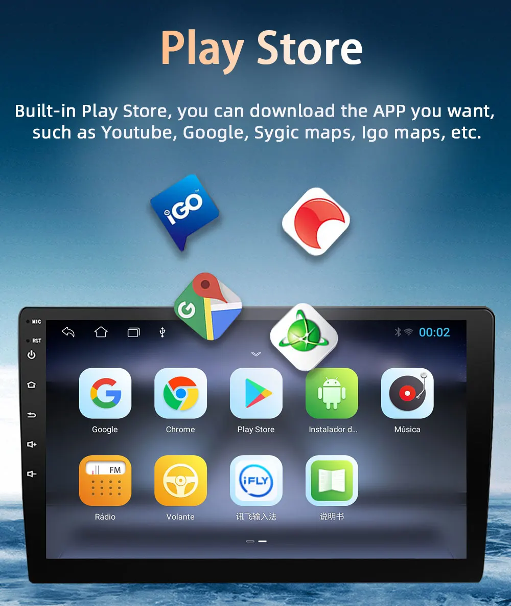 Встроенный Play Store, вы можете загрузить нужное вам приложение, например Youtube, Google, Sygic maps,Google и т. д.
