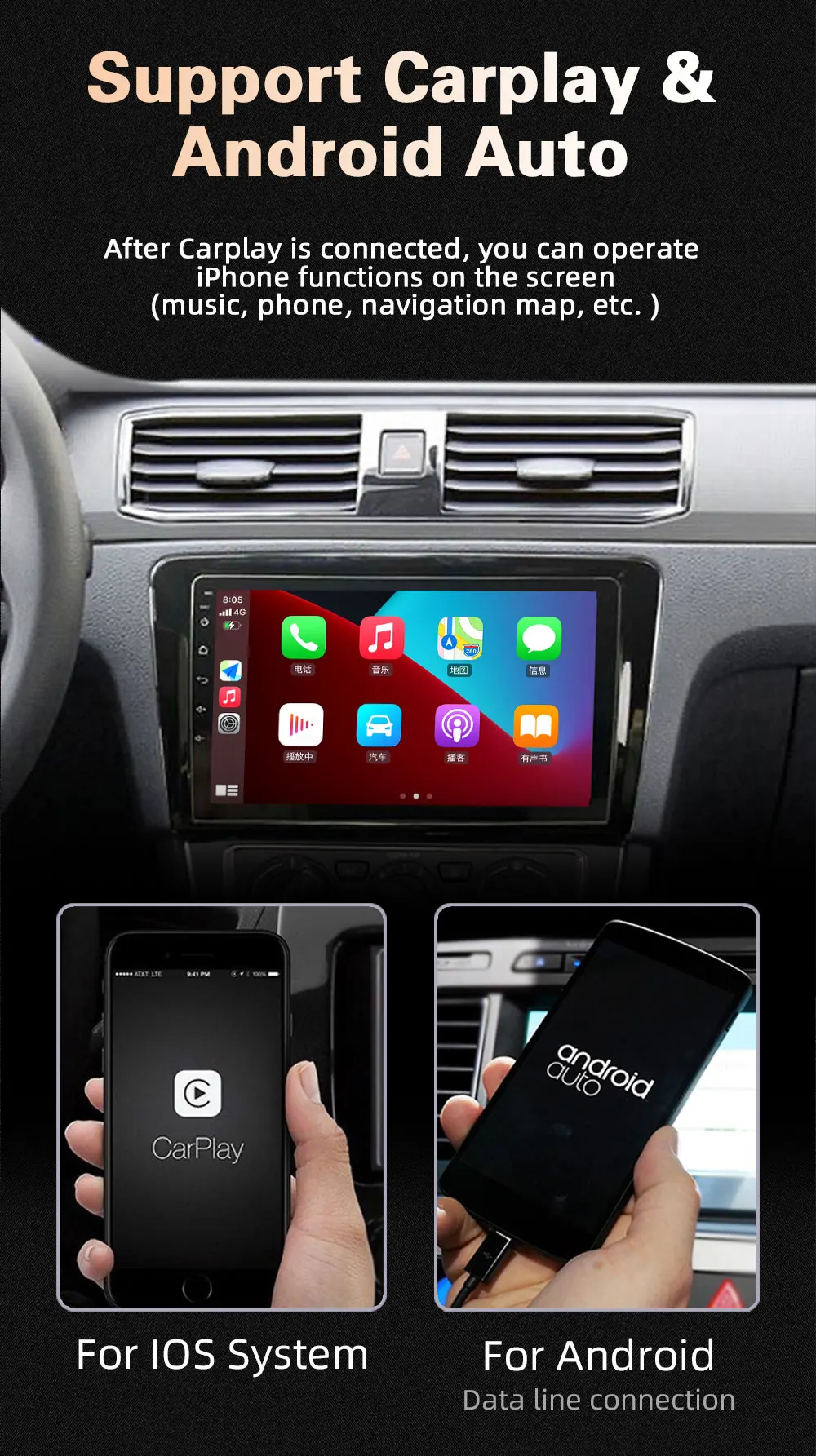 Поддержка подключения к iPhone через точку доступа Wi-Fi, поддержка подключения к телефону Android через usb-кабель и точку доступа Wi-Fi, фотографии телефонов, музыку, видео, навигация и т. д. будет отображаться на android-плеере