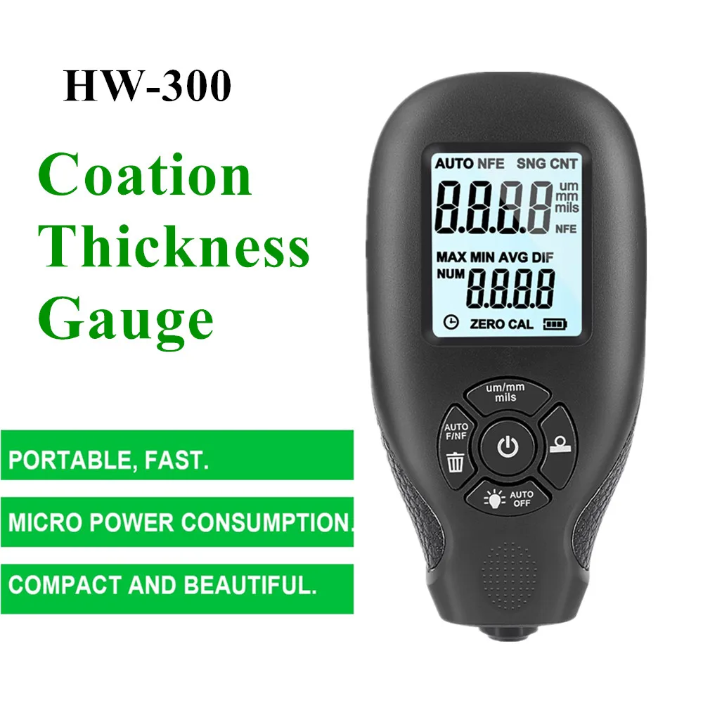 Название продукта: HW-300 толщиномер покрытияРазмер изделия: 110 мм * 52 мм * 25 ммМатериал: АБС-пластикРазрешение: 0,01 мм/1milДиапазон измерения: 0-2000 мкмТочность измерения: ±(3% + 1 мкм)Мощность поставки: 2 1,5 V AAA батареи (не прилагаются)Рабочая температура: -10 градусов Цельсия 50 градусов ЦельсияАксессуары: толщиномер 1 шт. + руководство + калибровочный лист, Упаковка белой коробки