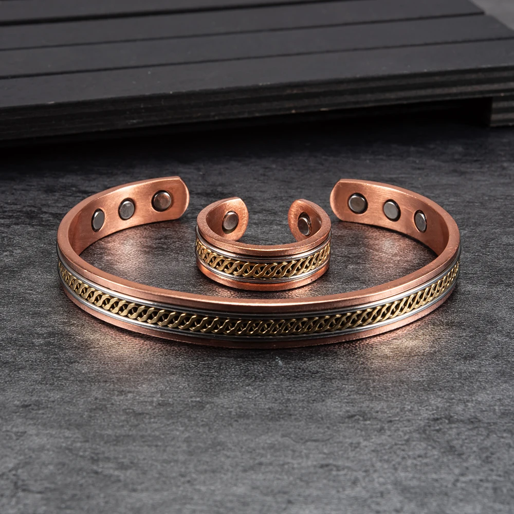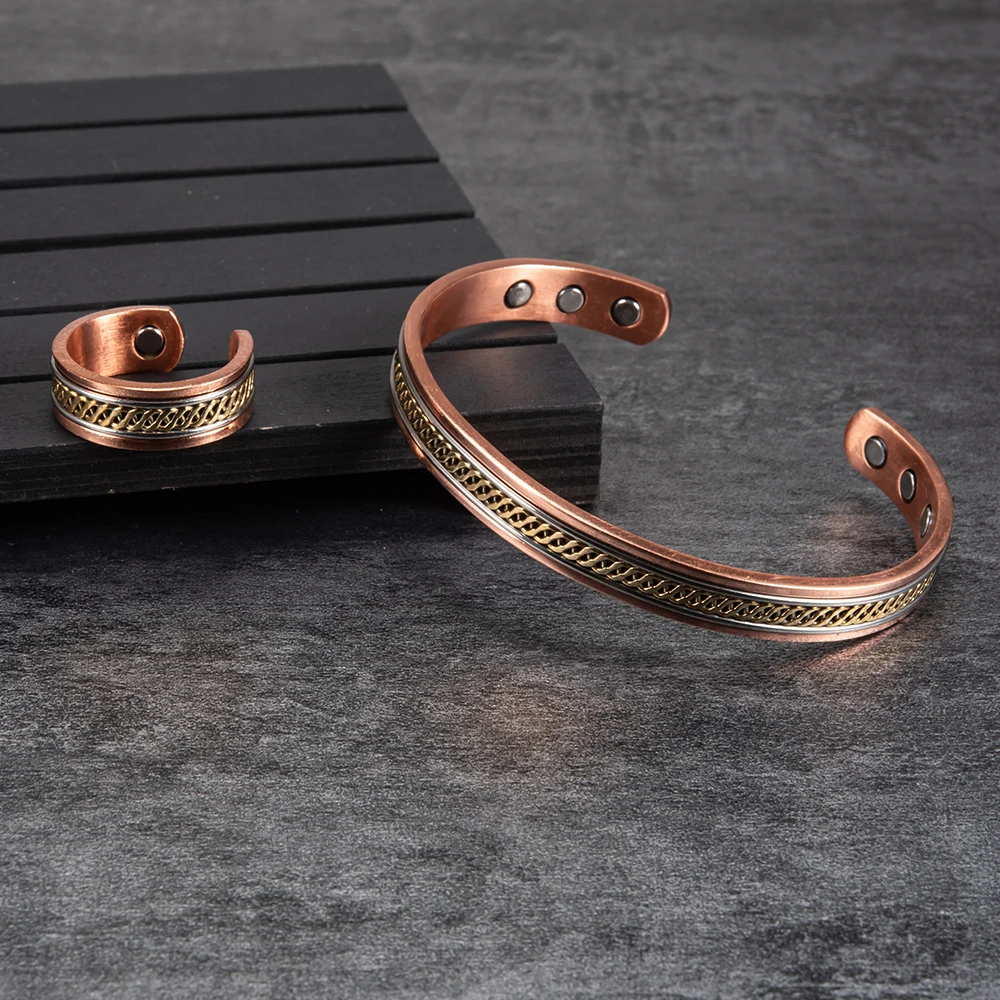 Комплект украшений из чистой меди для женщин, скрученные открытые манжеты, регулируемый медный магнитный браслет, кольцо для магнитной терапии под артрит золото