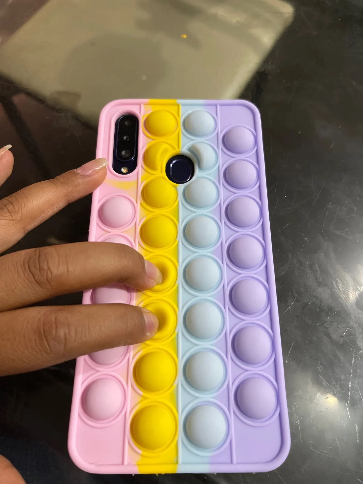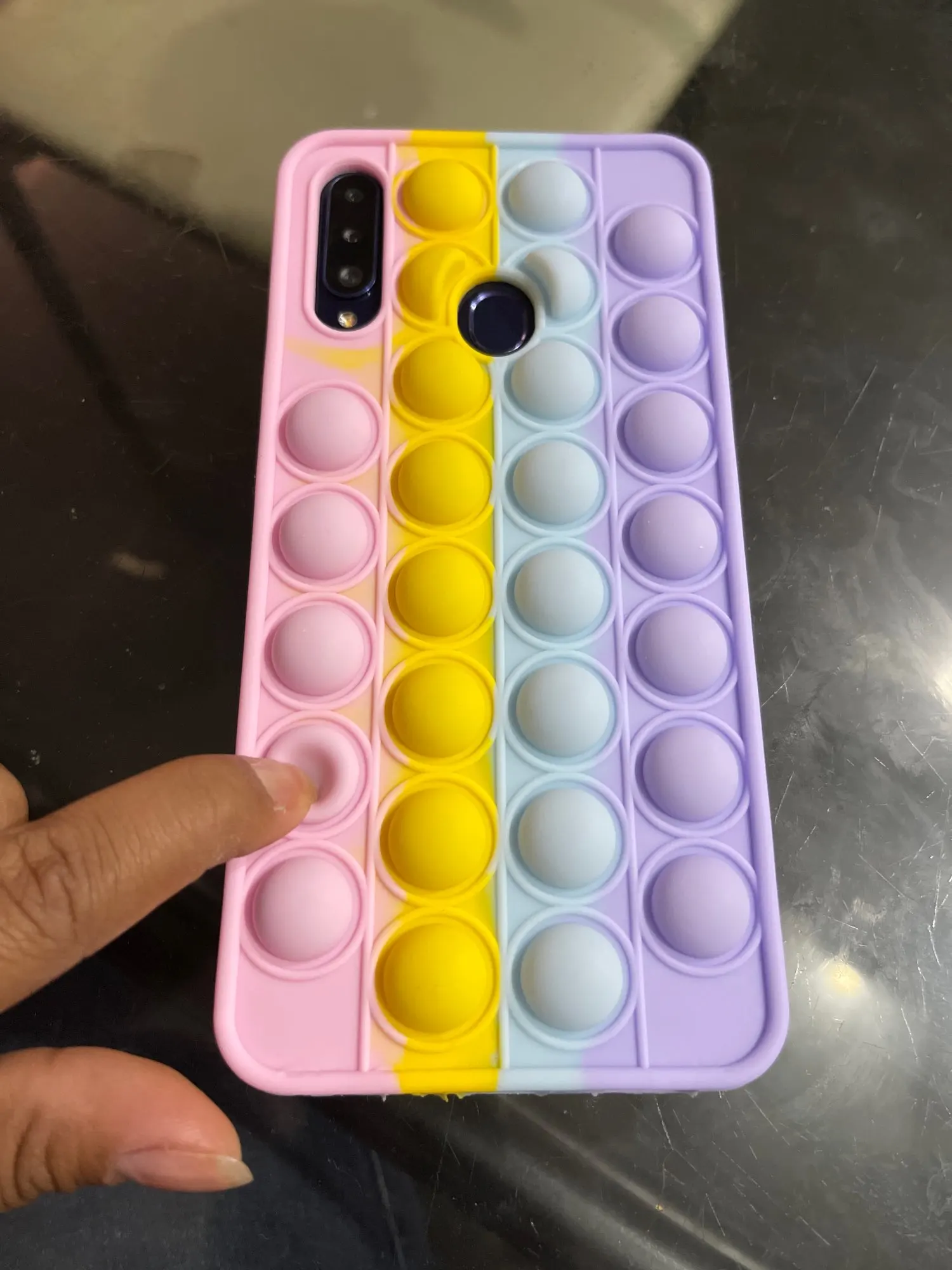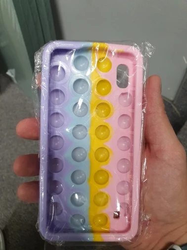 Cuando se coloca la funda no se puede utiliza ya que no funciona el poner presionar las bolitas. No es como los pop it. Se debería de quedar presionado creo o quizás por colocarle el teléfono ahí no se presiona pero no especifica