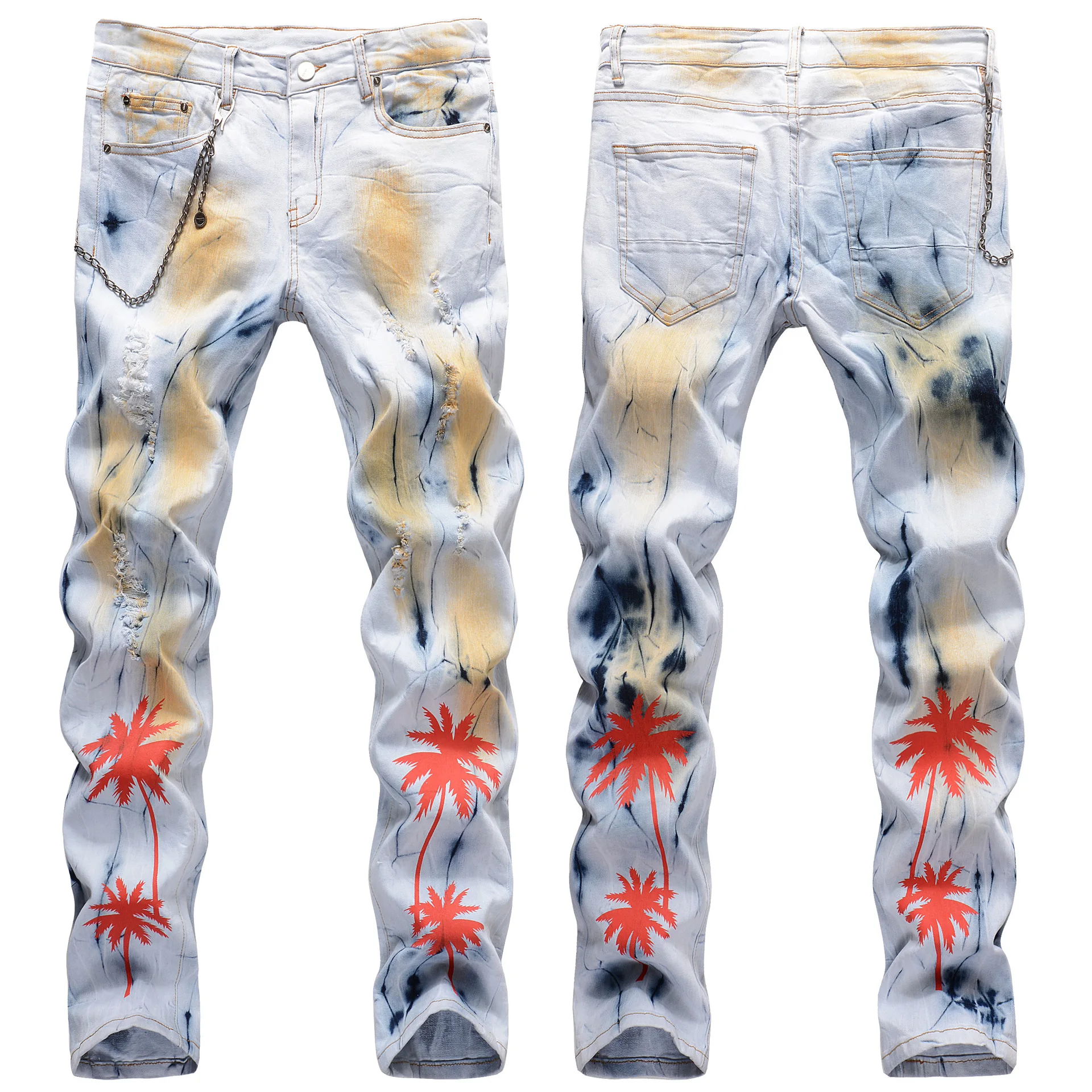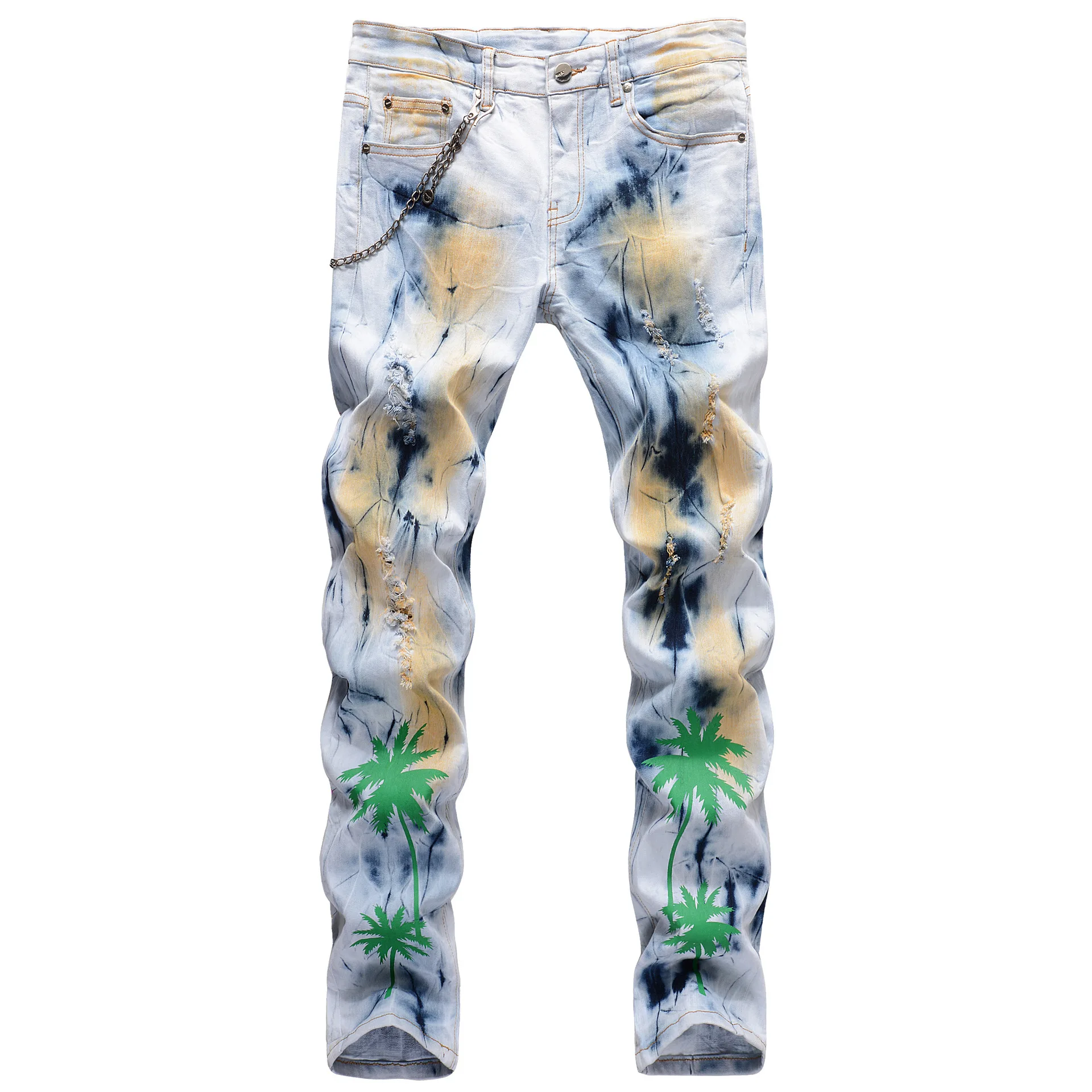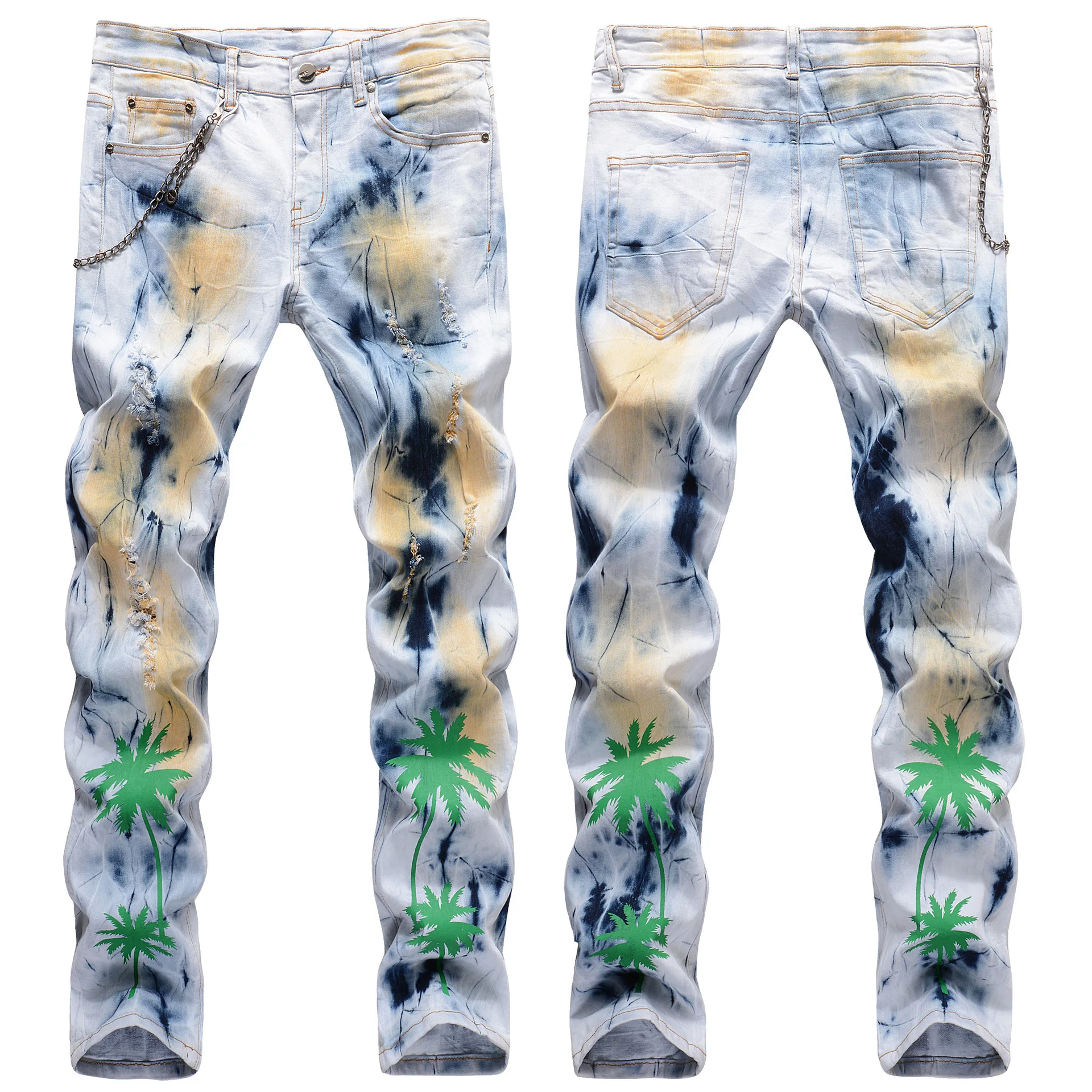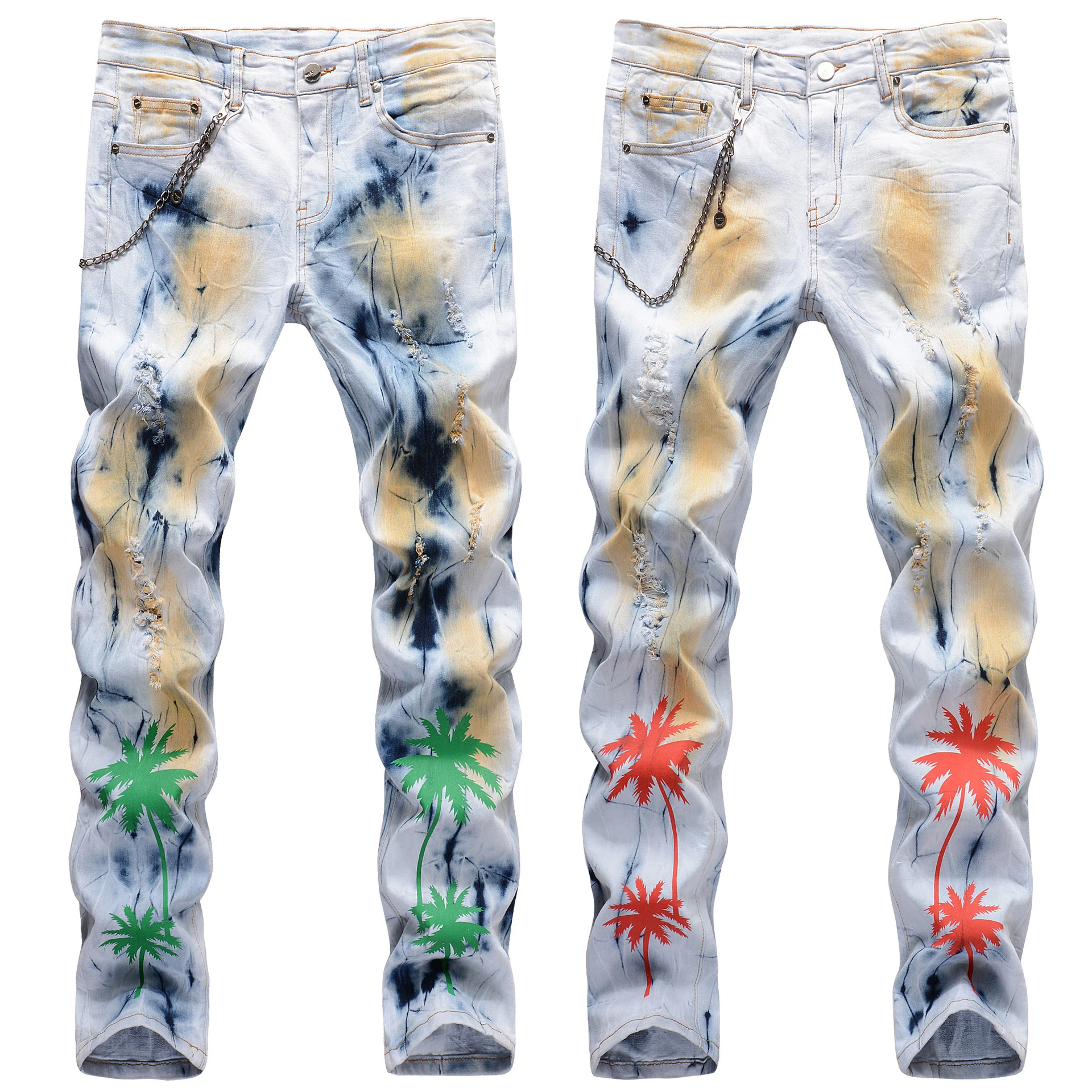 Светильник роскошные мужские джинсовые брюки, узкие Стрейчевые грязные джинсы, рваные джинсы с кокосовым деревом, уличная мода