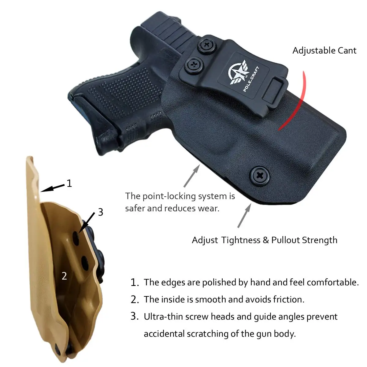 Полюс. Ремесло для Glock 26 кобура ручной работы изготавливается из прочной 0,8 "KYDEX. Он не только водонепроницаемый, устойчивый к поту, но также обладает высокой прочностью, высокой прочностью, ударопрочностью, износостойкостью и устойчивостью к старению. Может использоваться в различных условиях. Таким образом, вы всегда можете положиться на него, чтобы сохранить свою жизнь.