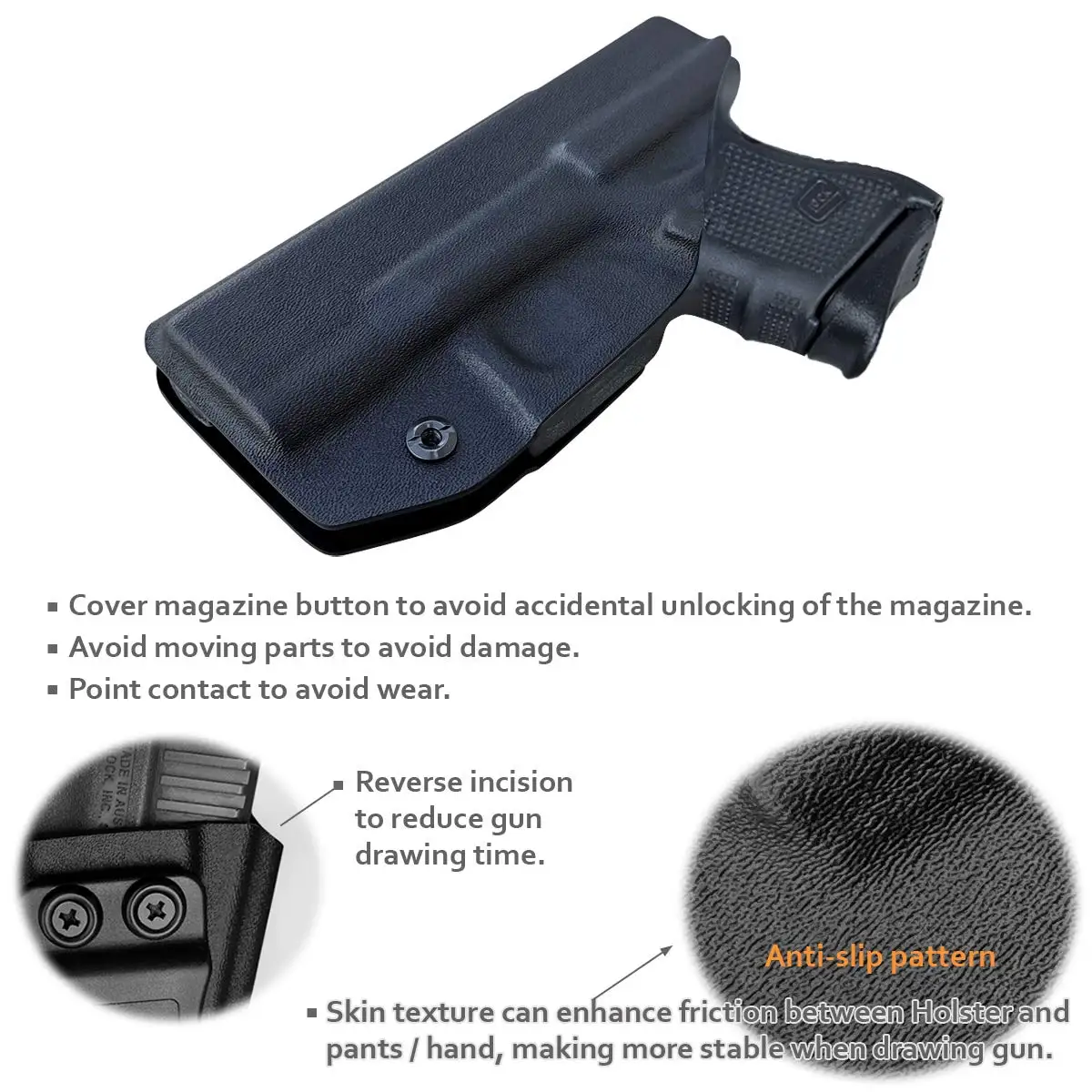 US .08 ”KYDEX ручная работа: легкий, прочный, прочный, влагостойкий, моющийся, обеспечивает комфорт и уверенность в любой ситуации. Кобура Glock 26 охватывает весь корпус, эффективно предотвращая пот и избегая зажимов, можно безопасно и безопасно использовать.