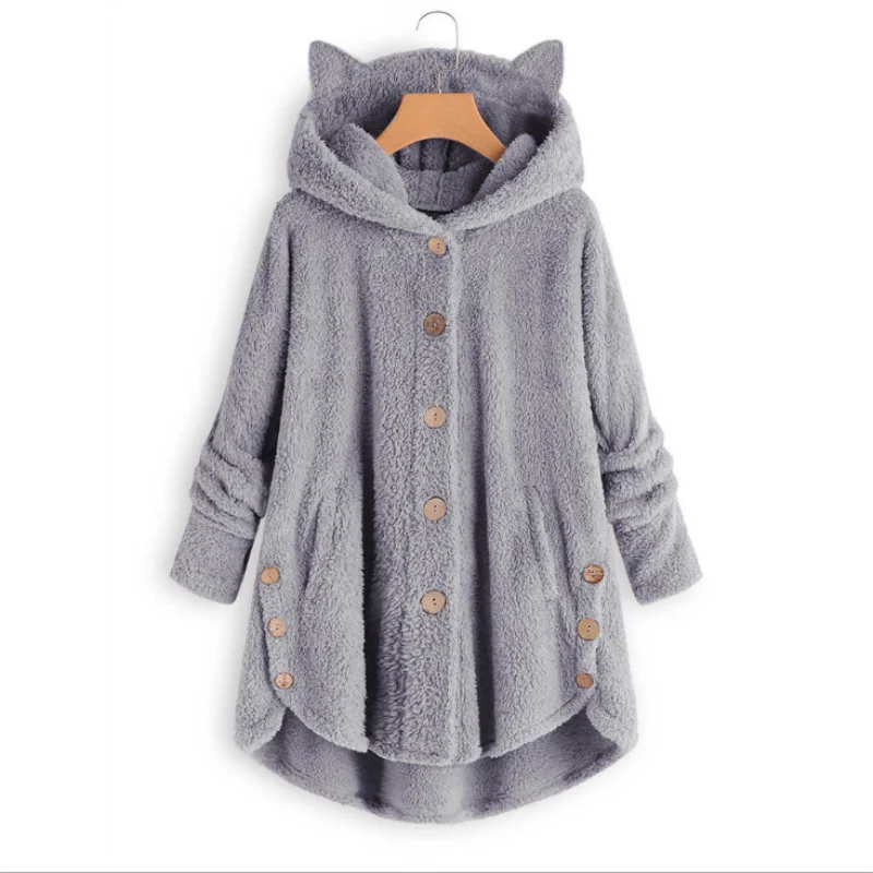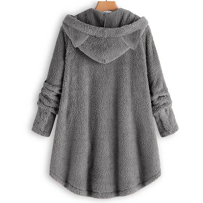 Женское плюшевое пальто с капюшоном, Зимняя Теплая Флисовая верхняя одежда на пуговицах с милыми кошачьими ушками, Женская однотонная Свободная куртка с асимметричным подолом