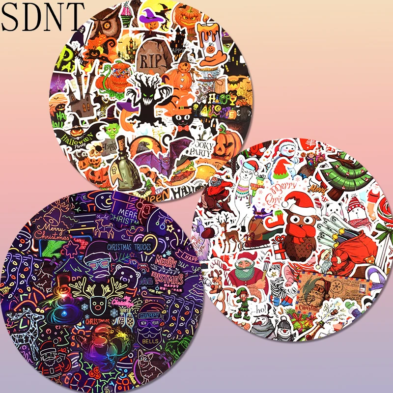 50 шт., рождественские наклейки на Хэллоуин для детей, вечерние неоновые водонепроницаемые наклейки на ноутбук, холодильник
