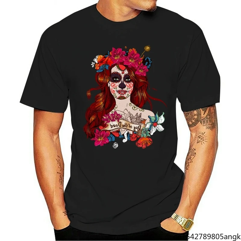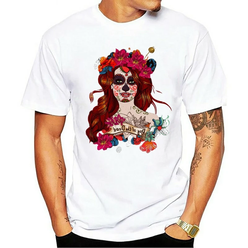 Мужская и женская футболка с круглым вырезом и изображением мексиканского сахарного черепа на Хэллоуин 2021