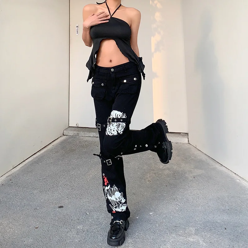 Брюки-карго Y2K в стиле панк, уличные штаны из денима с принтом чер...