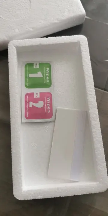 Фильм очень понравился. Пришел в пенопластовой коробке. В наборе 4 пленки (каждая в отдельном пакете), 4 салфетки (влажная, сухая) и шпатель для разглаживания пленки. Вставить очень просто. Покупкой очень доволен.