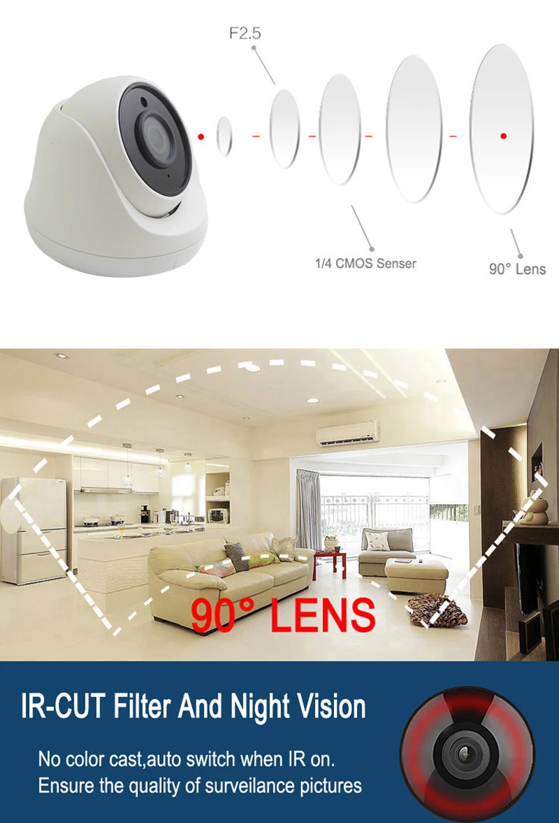 1.HD камера. 2. Разрешение: 4K/8MP Эффективное разрешение до 3840*2160. Поддержка замены камеры на 5 Мп/4 МП/2 МП через меню 3,10 шт. ИК-светодиодов с 5-25 м ИК-расстоянием 4. Встроенный IR-CUT фильтр, дневное и ночное видение 5. Высококачественный ABS пластиковый чехол, используемый в помещении 6. Стандартный объектив: объектив HD 3,6 мм (объектив 6 мм/8 мм опционально). 7.AHD (аналог высокой четкости), новый формат видео для улучшенной CVBS (КОМЕТА *) и HD передачи видео. 8. HD AHD камера является стандартом передачи аналогового HD видео с помощью коаксиального кабеля, что позволяет передавать HD на большие расстояния по более низкой цене, чтобы удовлетворить требования к сложной и большой установке. 9. Обычно используется коаксиальный кабель, SYV-75-5 кабель может передавать видео более 500 метров. 10. Должен работать с 4K AHD DVR 11. Лучший выбор для восстановления проекта. 12. Вы можете обновить старую аналоговую систему безопасности до HD камер без изменения кабелей.*** P.S: перед заказом, пожалуйста, подтвердите, что у вас есть видеорегистратор, который поддерживает AHD. Обычный видеорегистратор не поддерживает AHD камеры.Карта видеозахвата не поддерживает AHD камеру, не поддерживает прямое подключение к телевизору