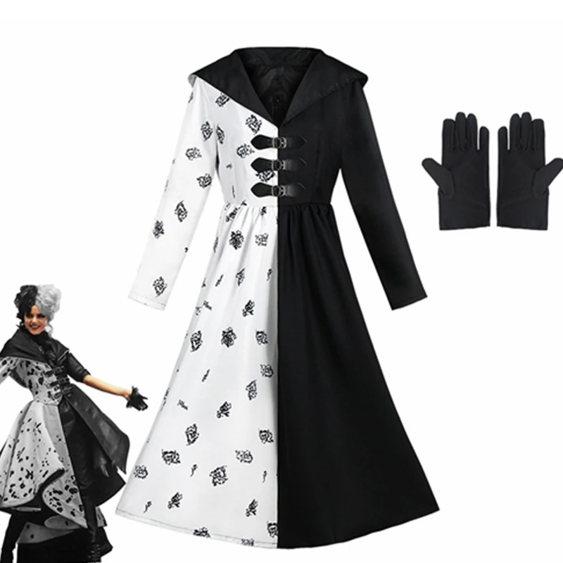 Женский карнавальный костюм из фильма «Круэлла де Виль», костюм со злым платьем, перчатки, наряд на Хэллоуин, Карнавальная одежда для вечеринки, Униформа с париком
