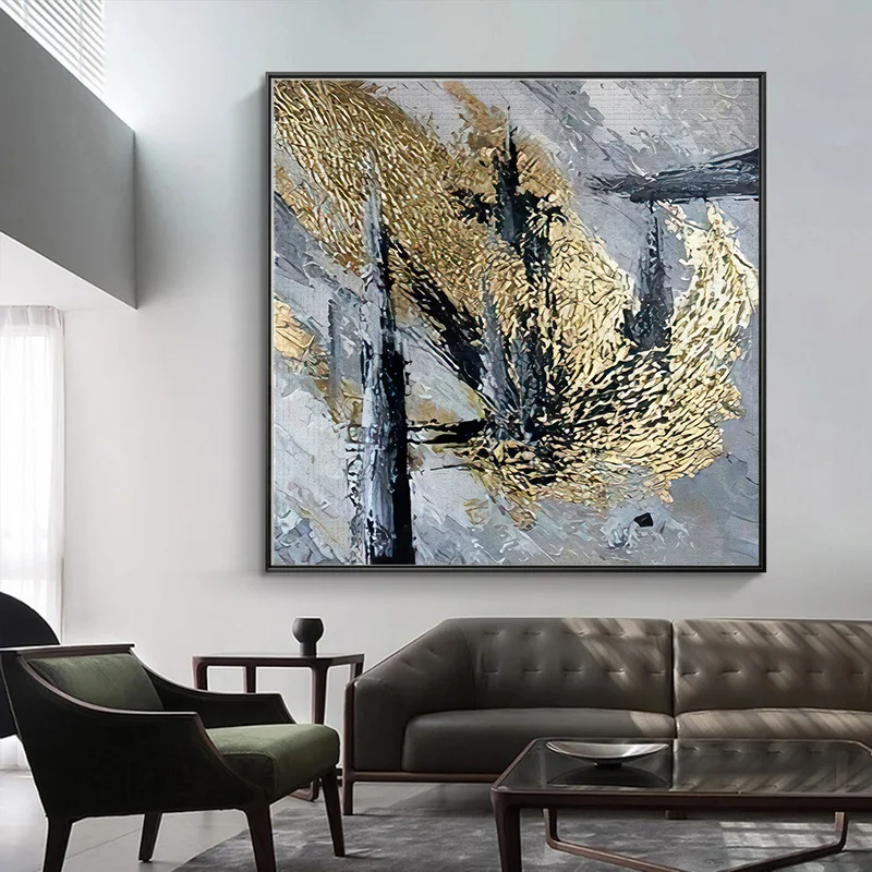 Абстрактная Картина на холсте с золотыми листьями, современный плак...