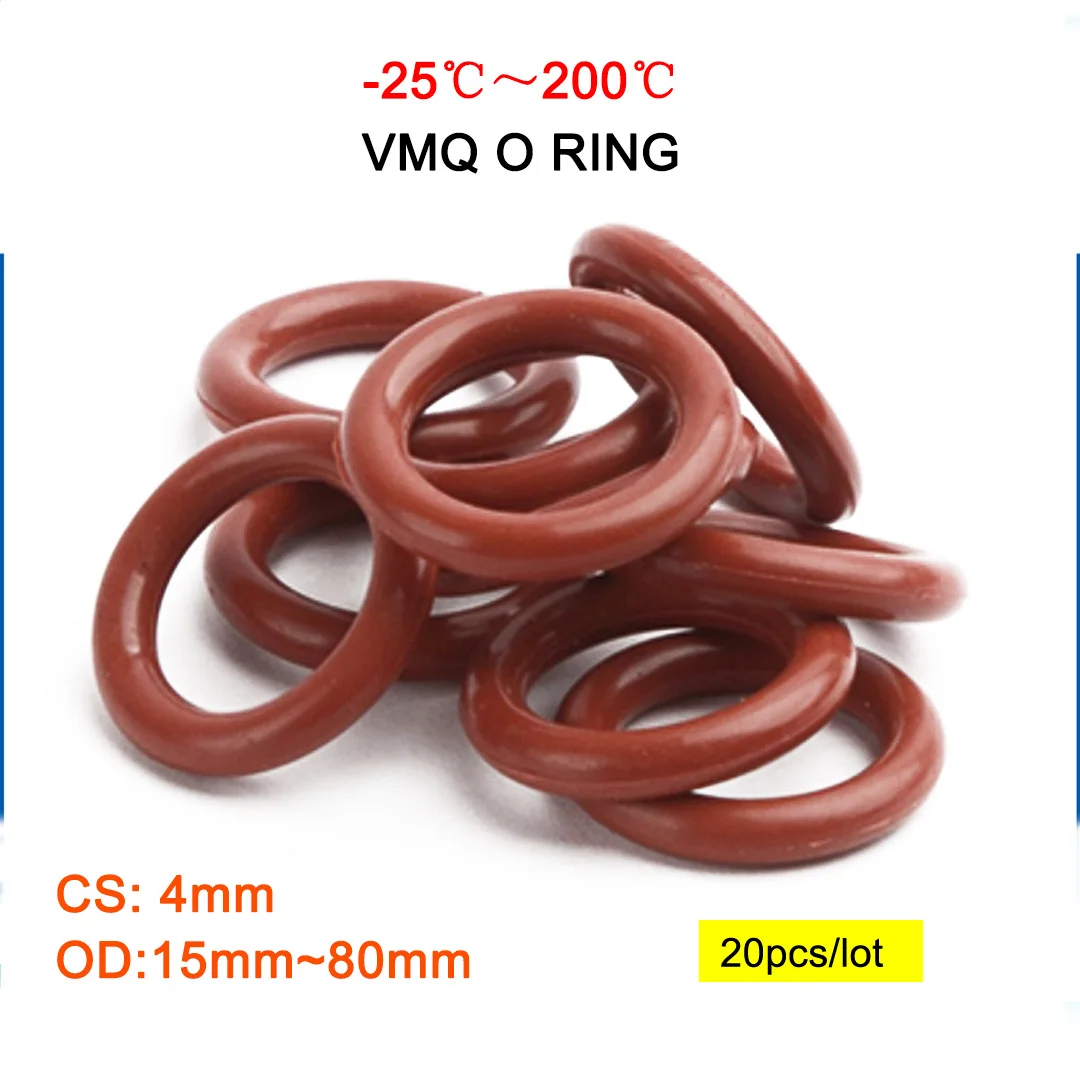 Уплотнительное кольцо VMQ, 20 шт., наружный диаметр 15-45 мм, толщина CS 4 мм, изолированная Водонепроницаемая Шайба из силиконовой резины, круглая, Нетоксичная, красная