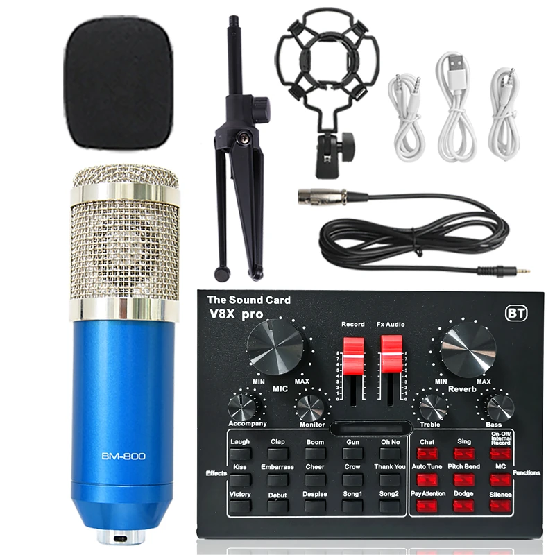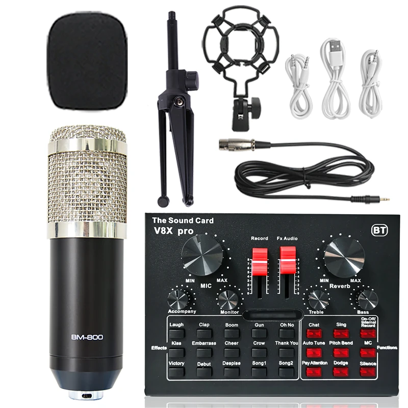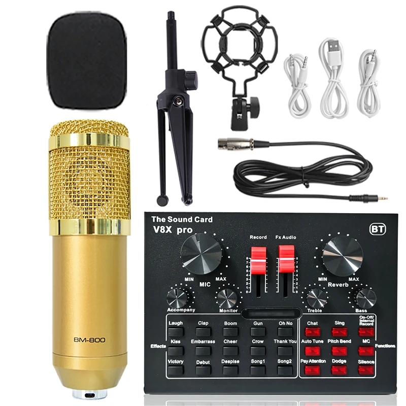 Конденсаторный микрофон BM 800, звуковая карта V8XPRO, штатив, профессиональный студийный беспроводной караоке Bluetooth для ПК, компьютера, телефона, микрофон