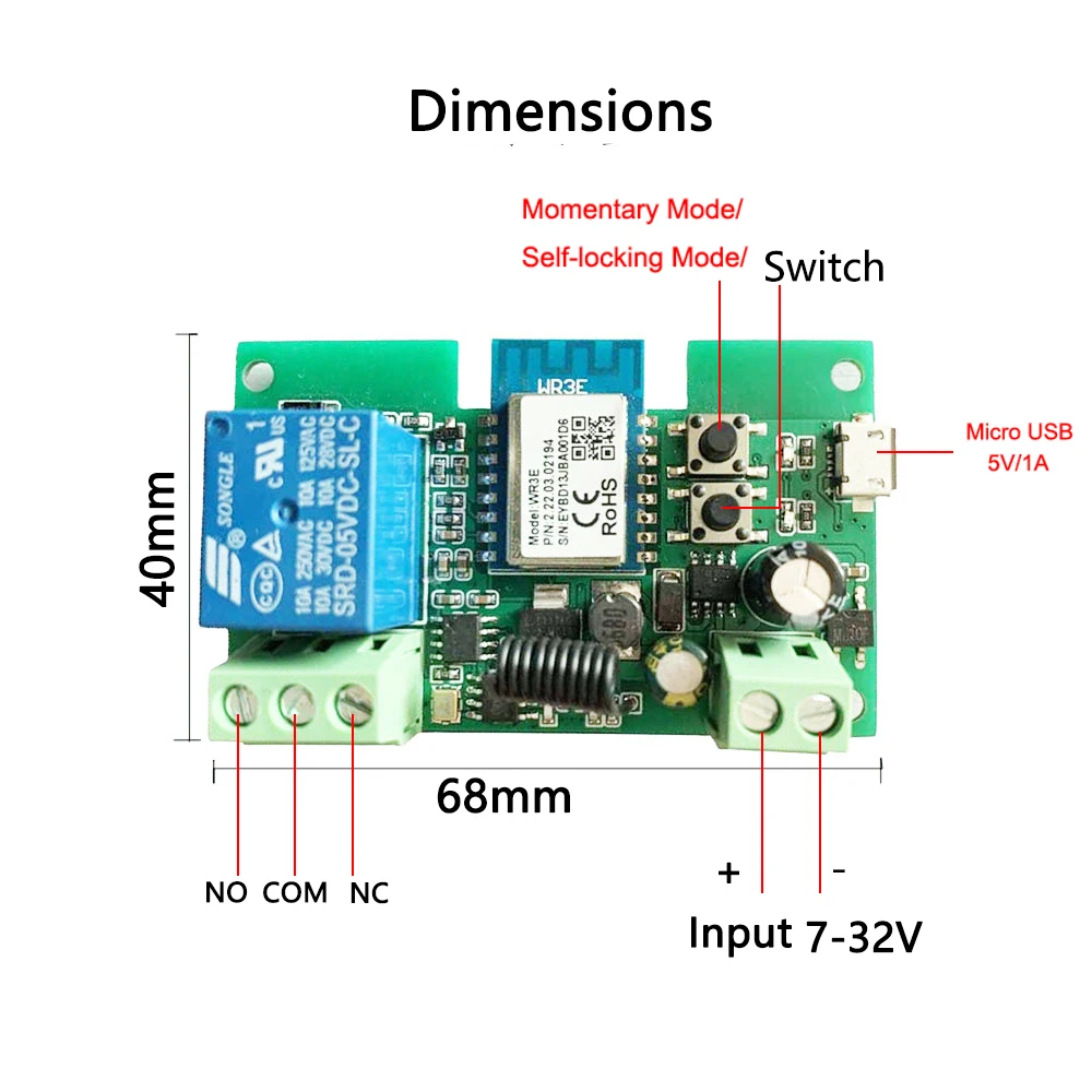 Тип 1. Рабочее напряжение: 7-32 В, поддержка 433 МГц RFТип 2.(пульт дистанционного управления без батареек) * С инструкцией по включению сигнала светильник инструкцией по включению реле* Мощность <1 Вт и Ток покоя: 80 мА* Ток Отключения <10 А, напряжение отключения <250Релейный режим 10 А* Срок службы модели реле более 1000, 00* Сопротивление изоляции: 100* Максимальное время включения: 15 м* Максимальное время выпуска: 5 м* Рабочая температура: от-40 до 70 градусов* Рабочая влажность: от 40% до 80% относительной влажности* Функция подключения по умолчанию: нажмите на открытое реле на мобильный телефон, затем автоматически отключите тягу (по умолчанию одна секунда), оно имеет функцию синхронизации одновременно.* Самоблокировка при нажатии кнопки подключения и блокировки при включенном светильник. Нажмите «открыть реле», чтобы натянуть, нажмите «закрыть реле», чтобы отключить.
