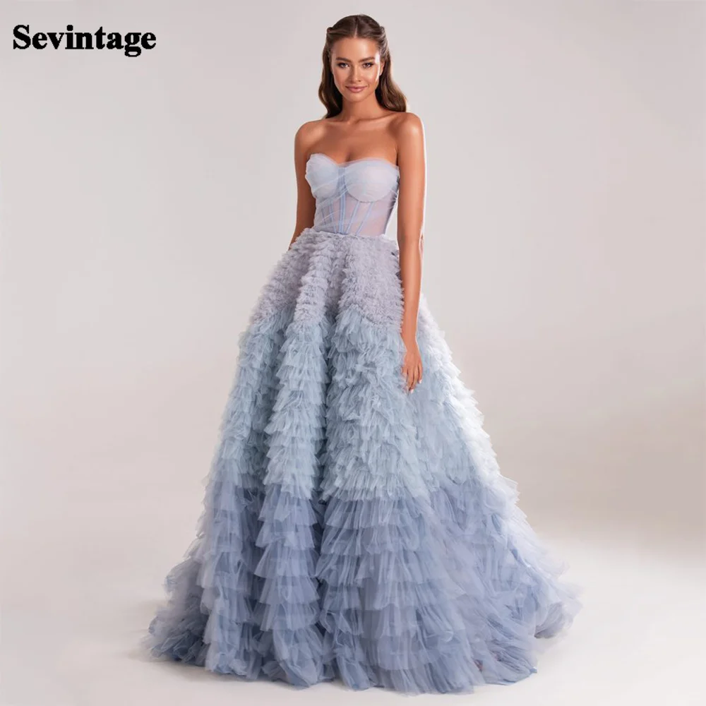 Синие платья Sevintage для выпускного вечера, Многоярусное Тюлевое платье с открытой спиной для свадебной вечеринки, без рукавов, без бретелек, Пляжное свадебное платье