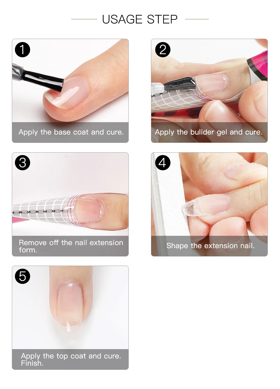 5. Нанесите один шаг геля на весь гвоздь и Расширьте его до желаемого положения, затем высушите его под светодиодный лампой около 30s или УФ-лампой для 120s.
