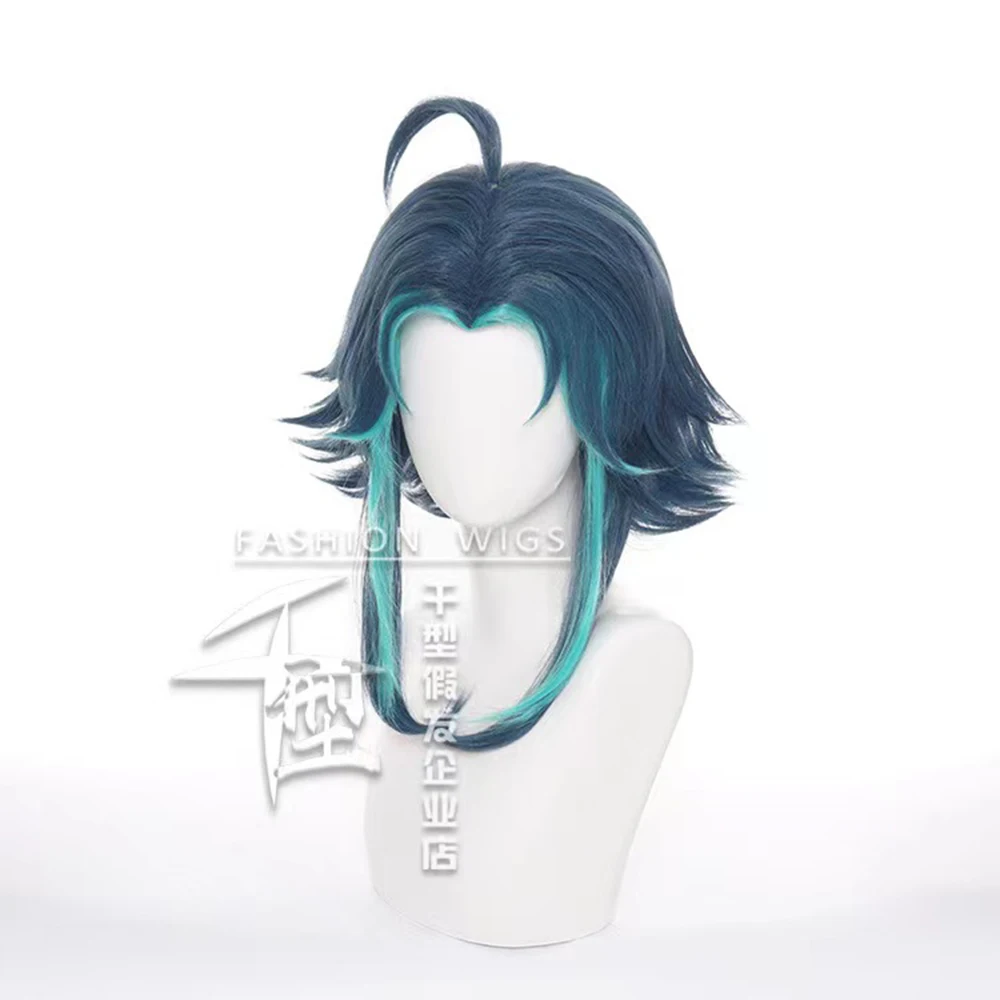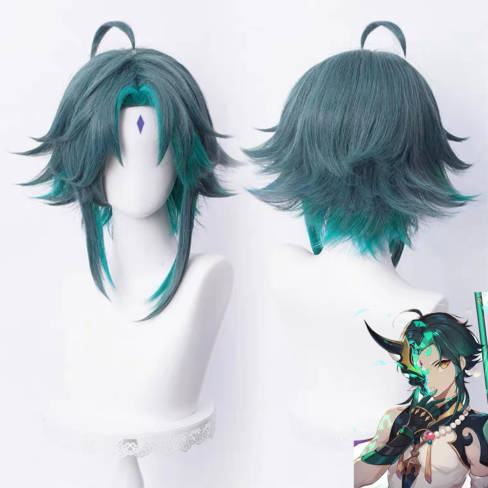 Парик для косплея Genshin Impact Xiao, темно-зеленые синтетические короткие прямые Термостойкие волосы для взрослых женщин, Бесплатный парик, шапочка, случайные Стикеры