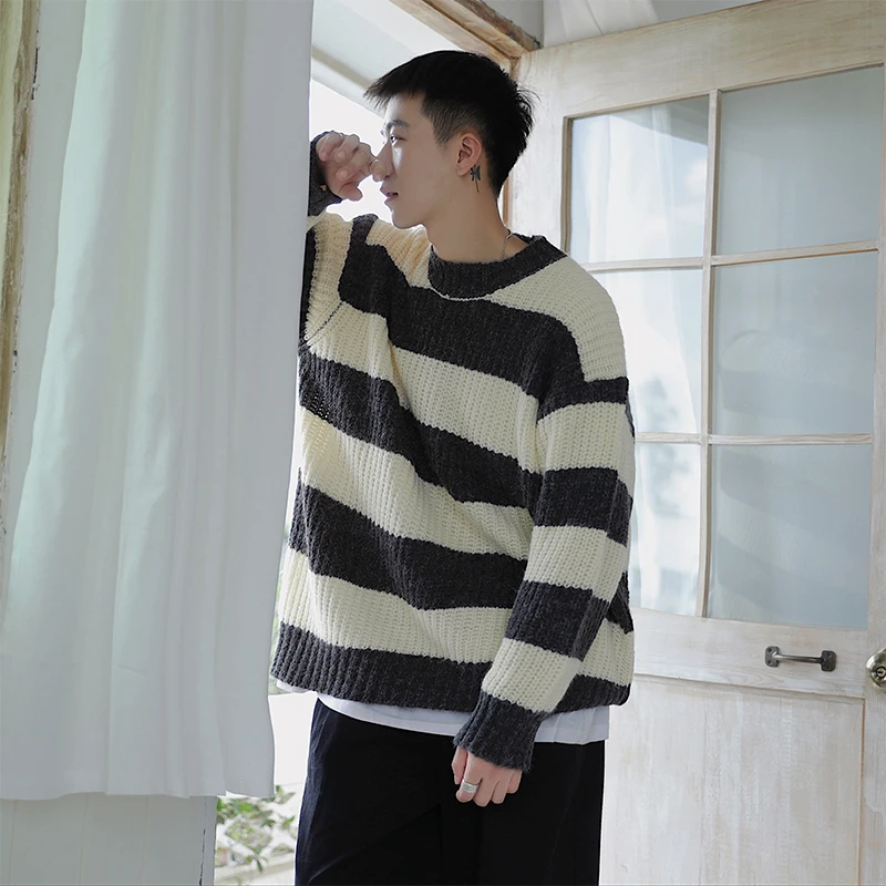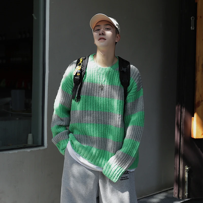 Мужской свитер в полоску, повседневный свободный трикотажный пуловер в Корейском стиле, Осень-зима, 2021