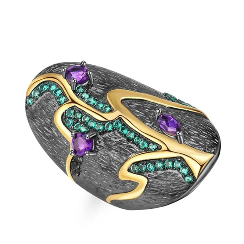 Обручальное кольцо в стиле бохо с фиолетовым и зеленым камнем