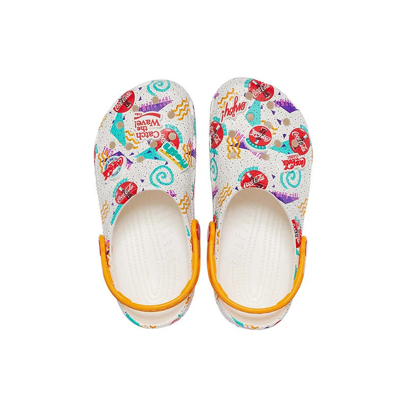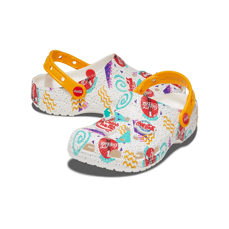 Эти классические сабо украшены ретро-графикой в стиле 90-х и логотипами компании Coca-Cola.