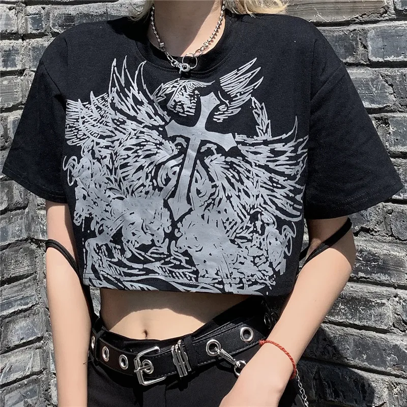 Укороченный топ в готическом стиле, футболка с рисунком Харадзюку, ...