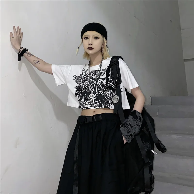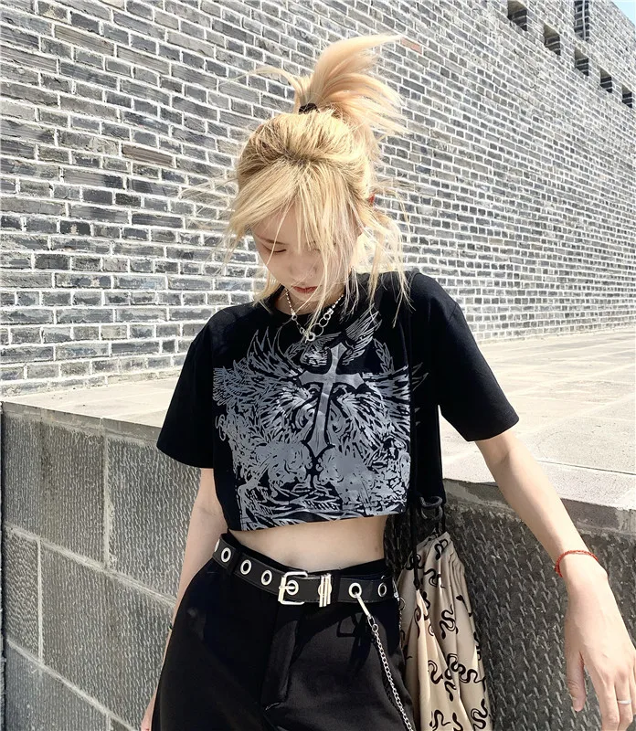Укороченный топ в готическом стиле, футболка с рисунком Харадзюку, женская футболка в Корейском стиле, летняя футболка с коротким рукавом y2k, одежда в готическом стиле