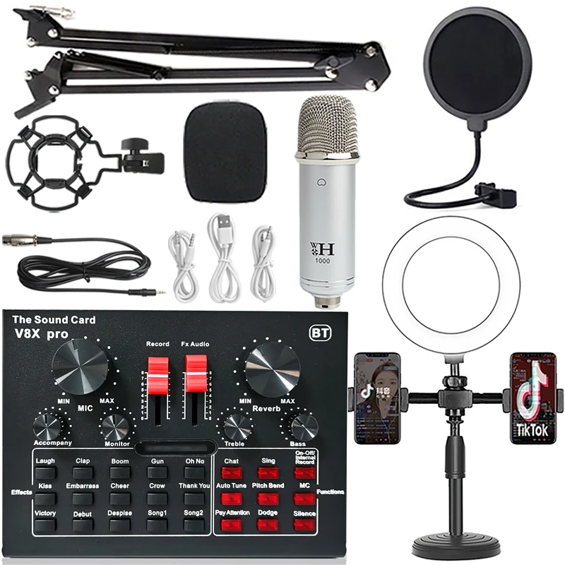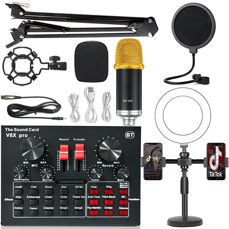 Профессиональный Студийный конденсаторный микрофон BM900 с кольцевым заполнясветильник, беспроводной микрофон для караоке, штатив, звуковая карта V8XPRO, микрофон для ПК и телефона