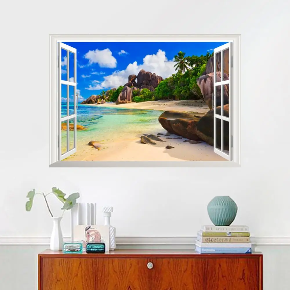 3d Наклейка на стену с морским пляжем, окном, для спальни, украшение для дома, пейзаж сделай сам, Настенная роспись, искусство, пейзаж, ПВХ наклейки