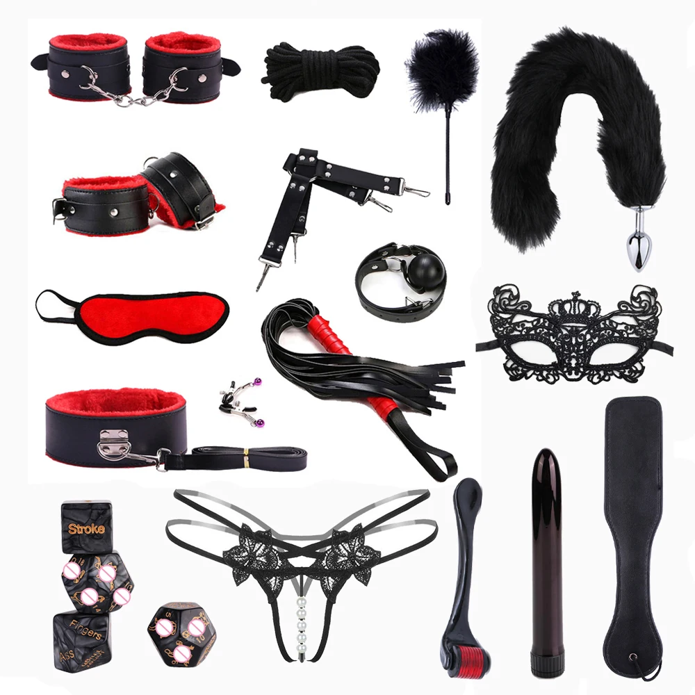 Наручники * 1 пара + манжеты на лодыжке * 1 пара + хлыст + воротничок + зажим для сосков + маска для глаз * 2 + кляп для рта + 5 м веревка + перекрестная пряжка + флисовые перья + Хвостовая вилка + шлепки + вибратор + секс кости * 4 + стринги + ролик микроиглы