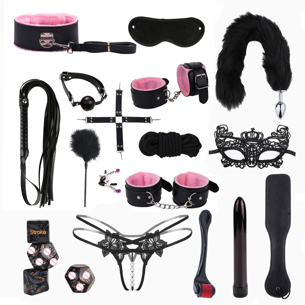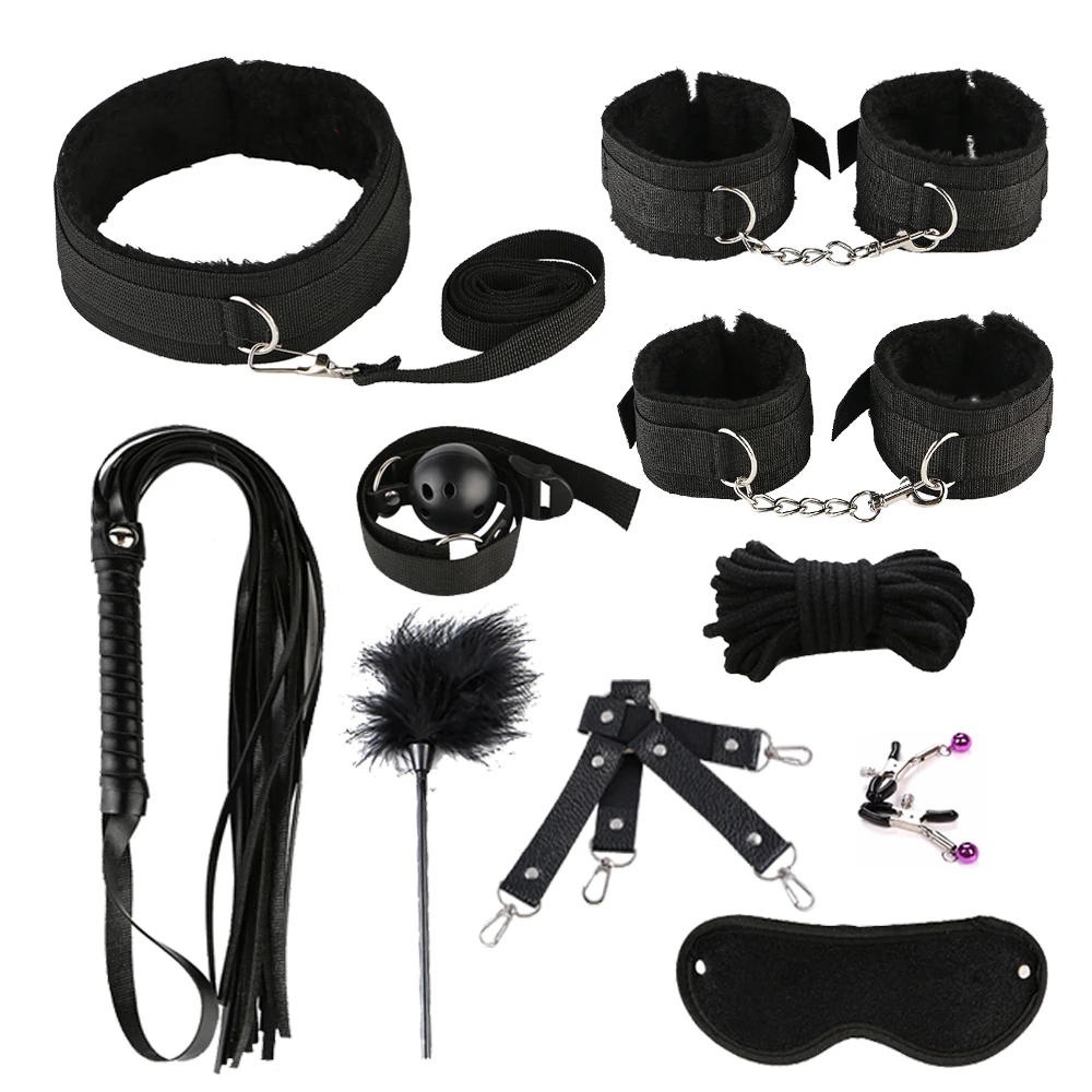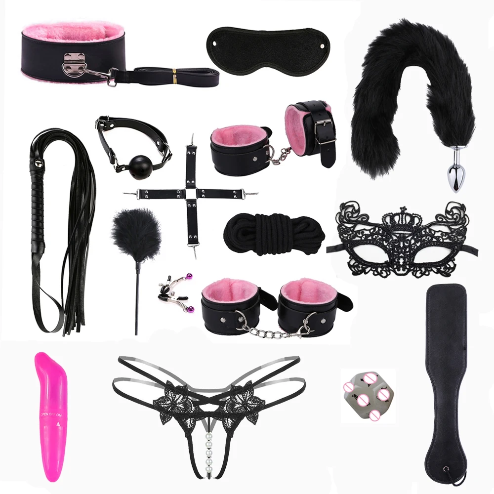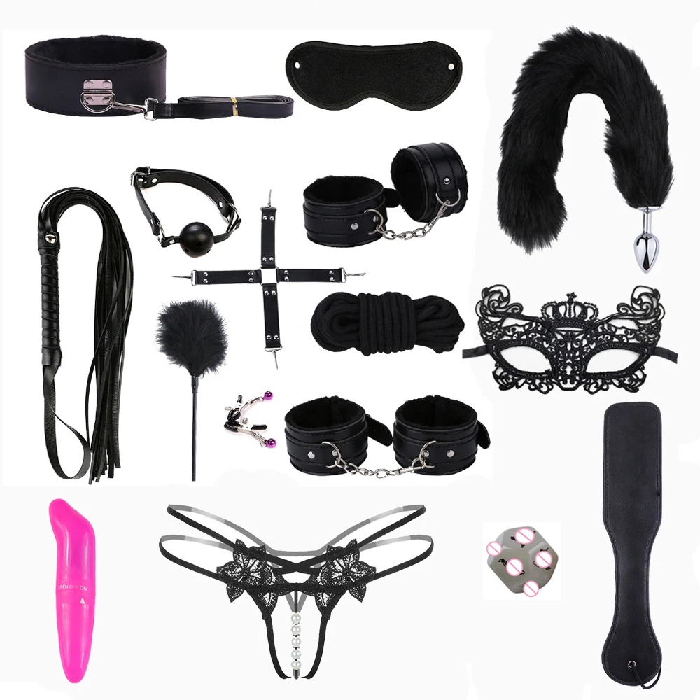 Наручники * 1 пара + манжеты на лодыжке * 1 пара + хлыст + воротничок + зажим для сосков + маска для глаз * 2 + кляп для рта + 5 м веревка + перекрестная пряжка + флисовые перья + Хвостовая вилка + шлепки + вибратор + секс кости + стринги
